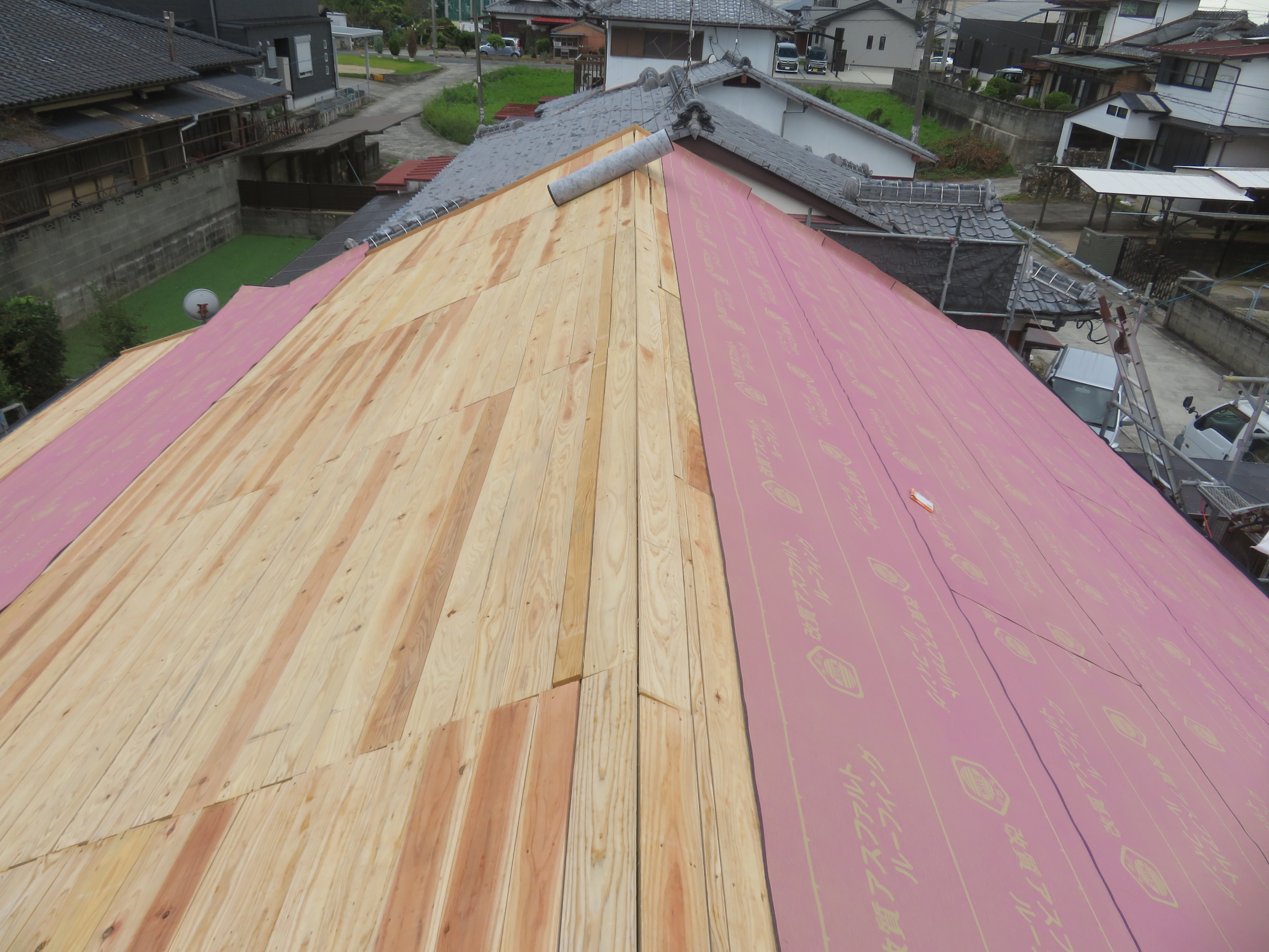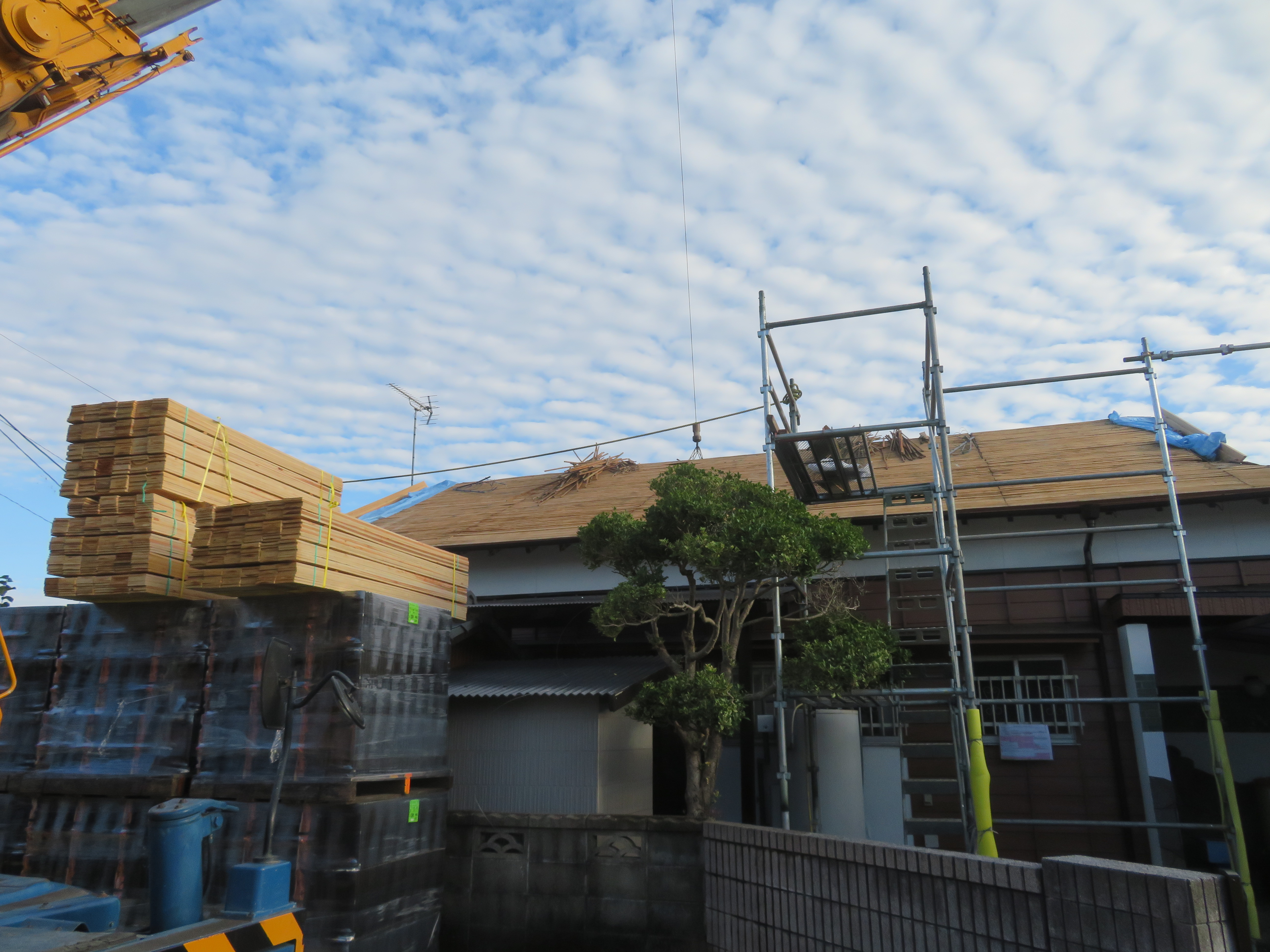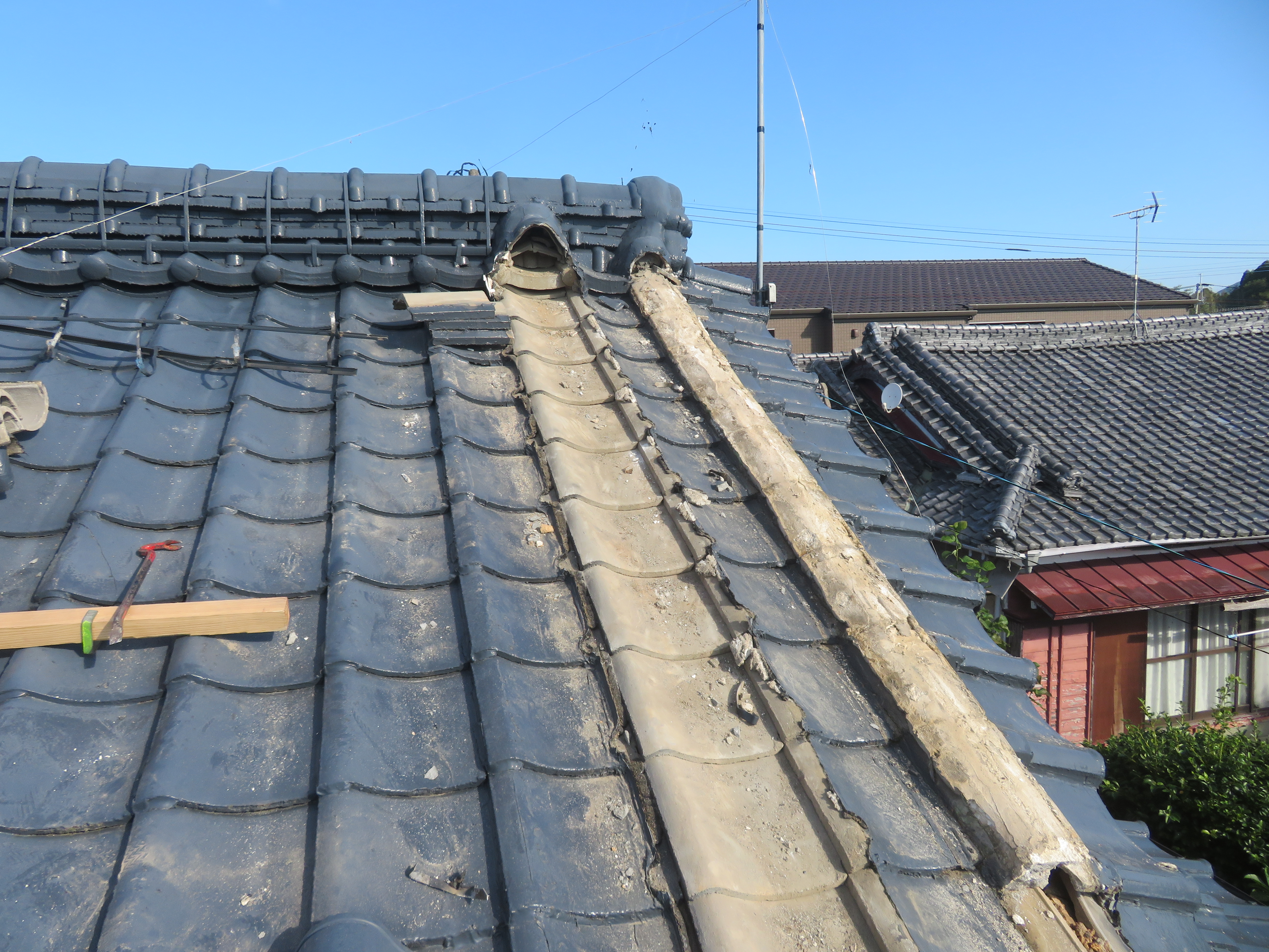 荒尾市本井手にて、屋根瓦の葺き替え 蓑甲造りの屋根を平板瓦に。 瓦を剥ぐ前に・・・。 下り棟と蓑甲を解体しました。10/6 新しい破風板を取り付けました。10/14 瓦剥ぎに取り掛かりました。 解体業者に依頼しました。 瓦を剥ぎ終わり、明日は野地板を打ちます。 10/20 ルーフィングを張れば、雨の心配はありません。 10/21 桟木を打って、瓦上げの準備完了です。 10/24 サンプルテキストサンプルテキスト 2025/10/24 20:21 Tweet