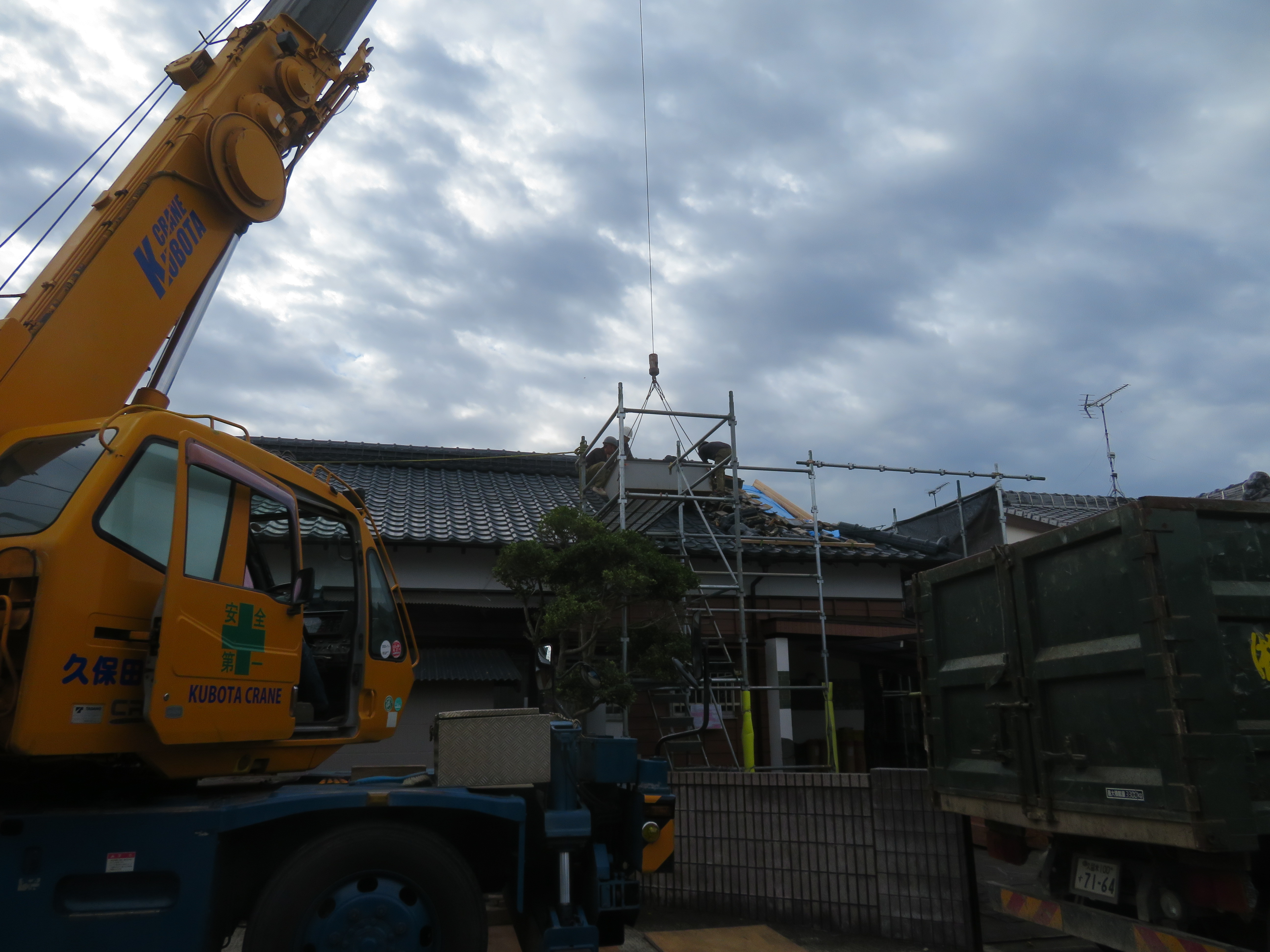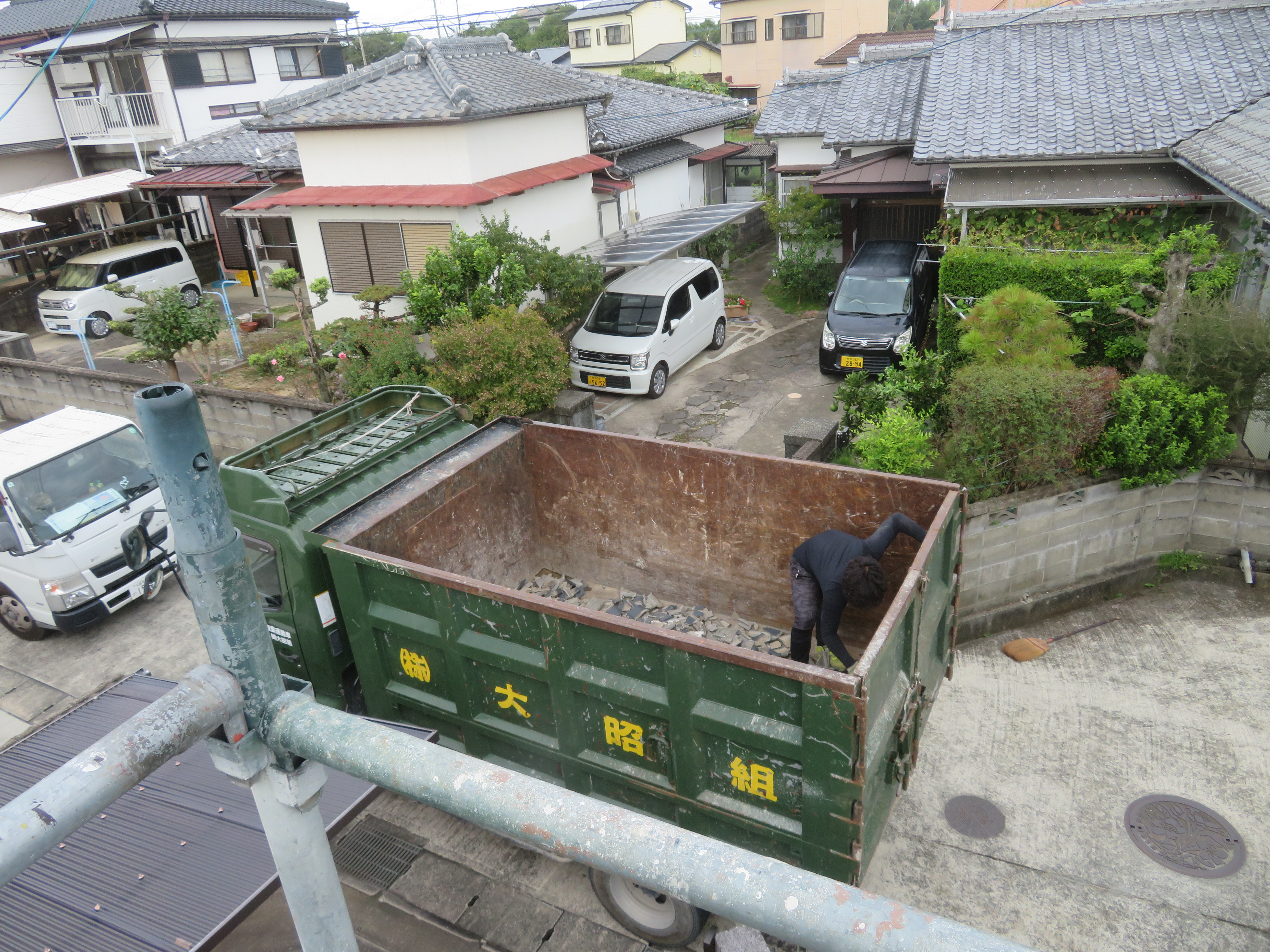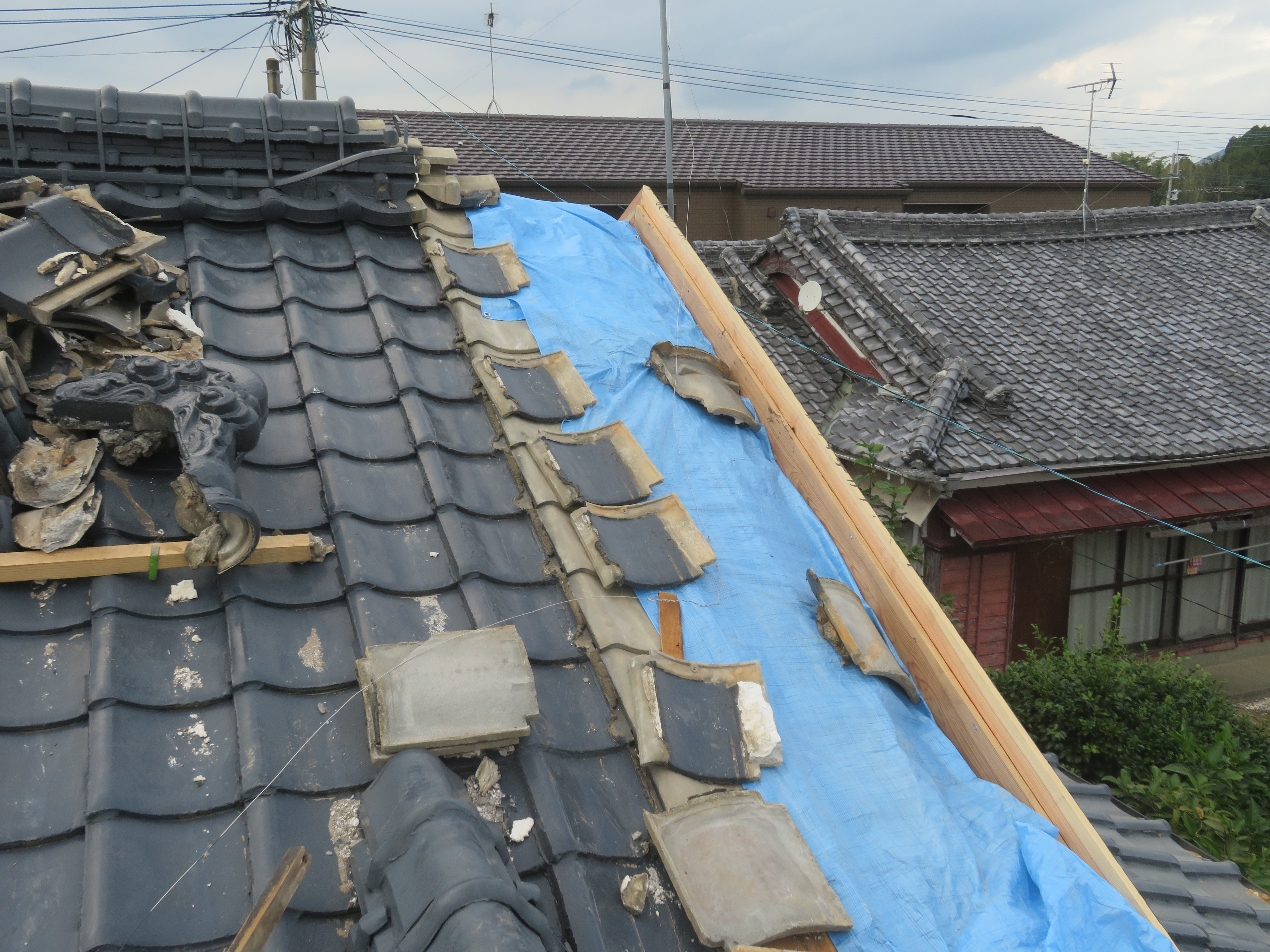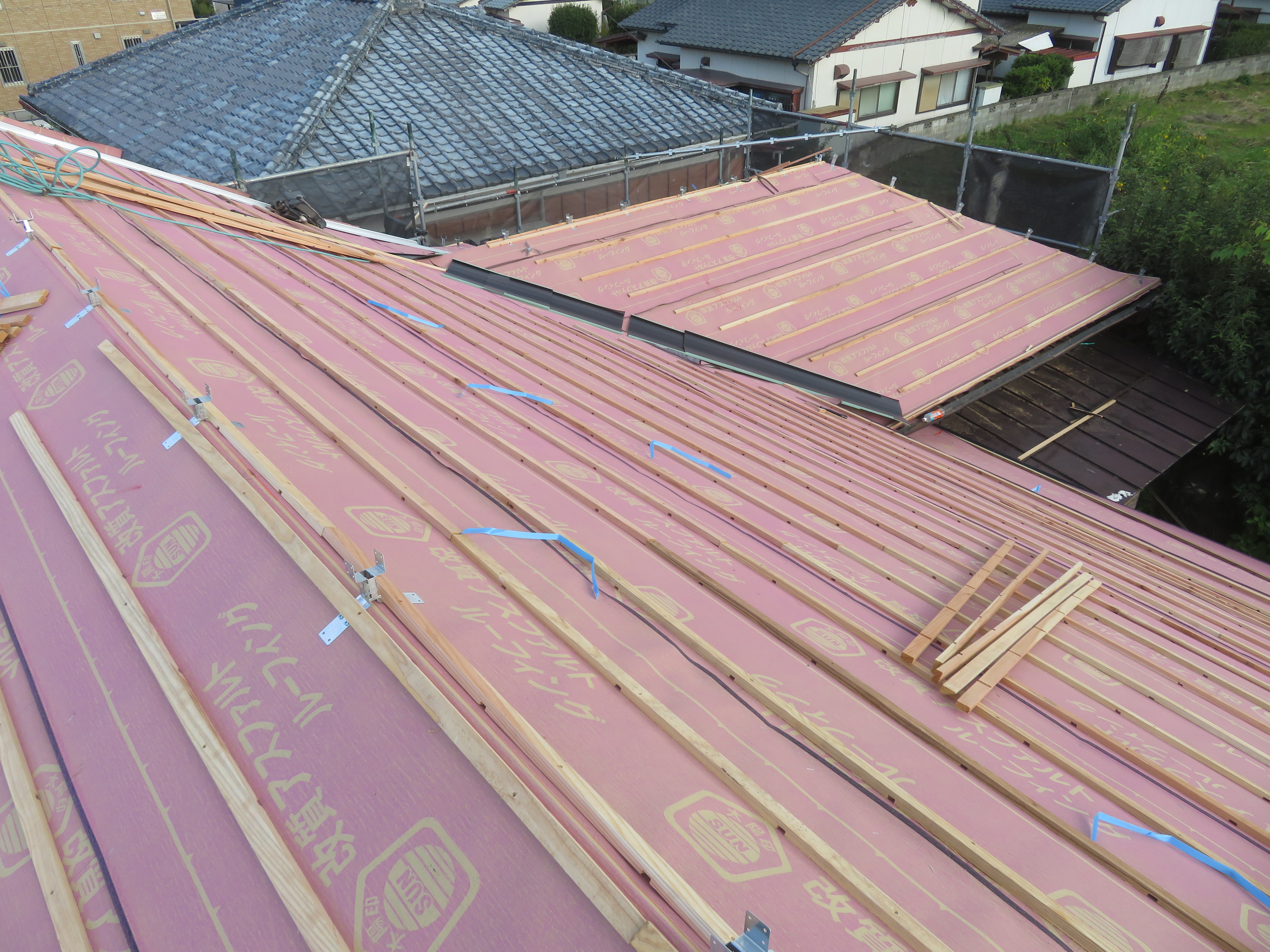 荒尾市本井手にて、屋根瓦の葺き替え 蓑甲造りの屋根を平板瓦に。 瓦を剥ぐ前に・・・。 下り棟と蓑甲を解体しました。10/6 新しい破風板を取り付けました。10/14 瓦剥ぎに取り掛かりました。 解体業者に依頼しました。 瓦を剥ぎ終わり、明日は野地板を打ちます。 10/20 ルーフィングを張れば、雨の心配はありません。 10/21 桟木を打って、瓦上げの準備完了です。 10/24 サンプルテキストサンプルテキスト 2025/10/24 20:21 Tweet