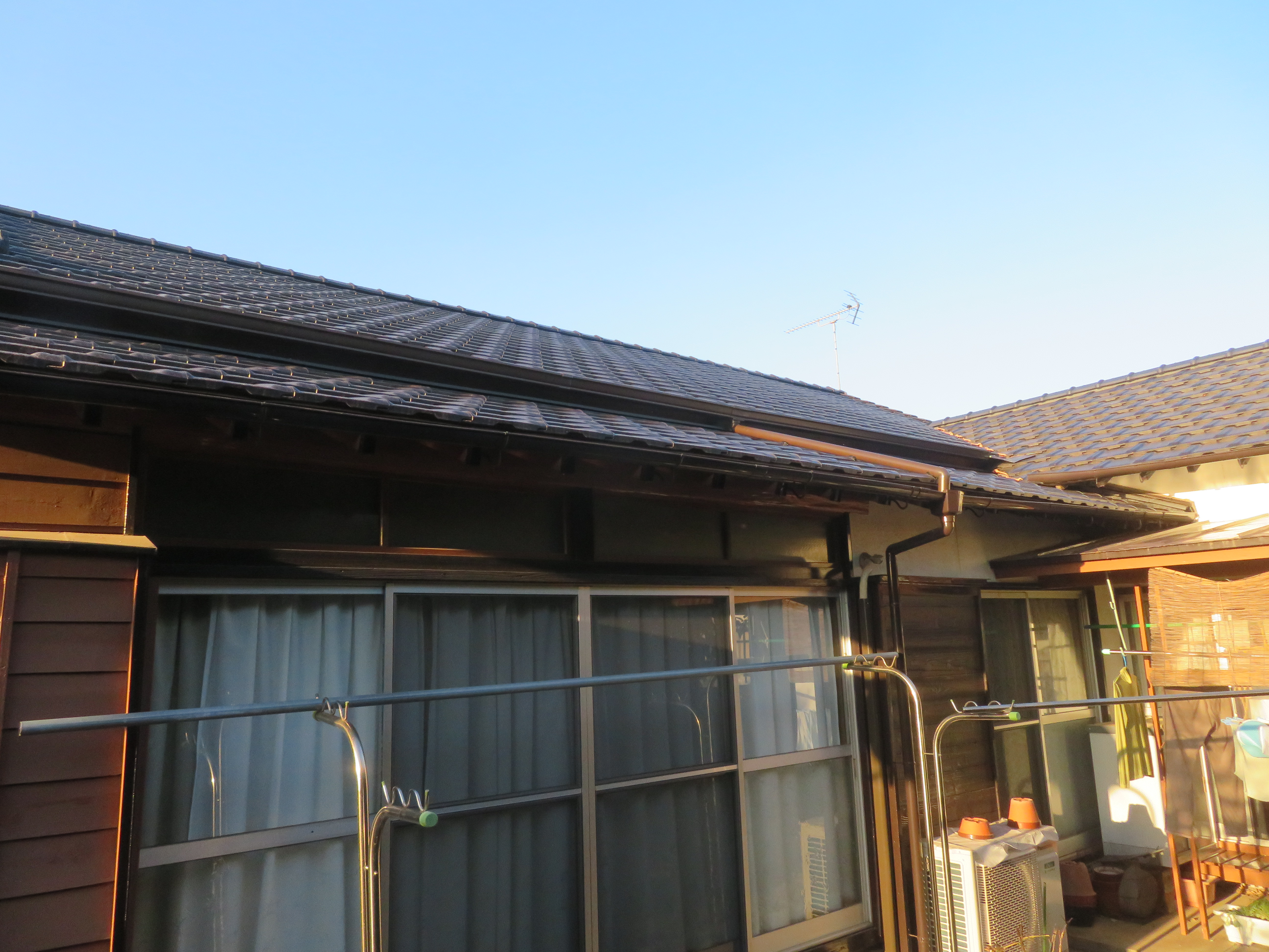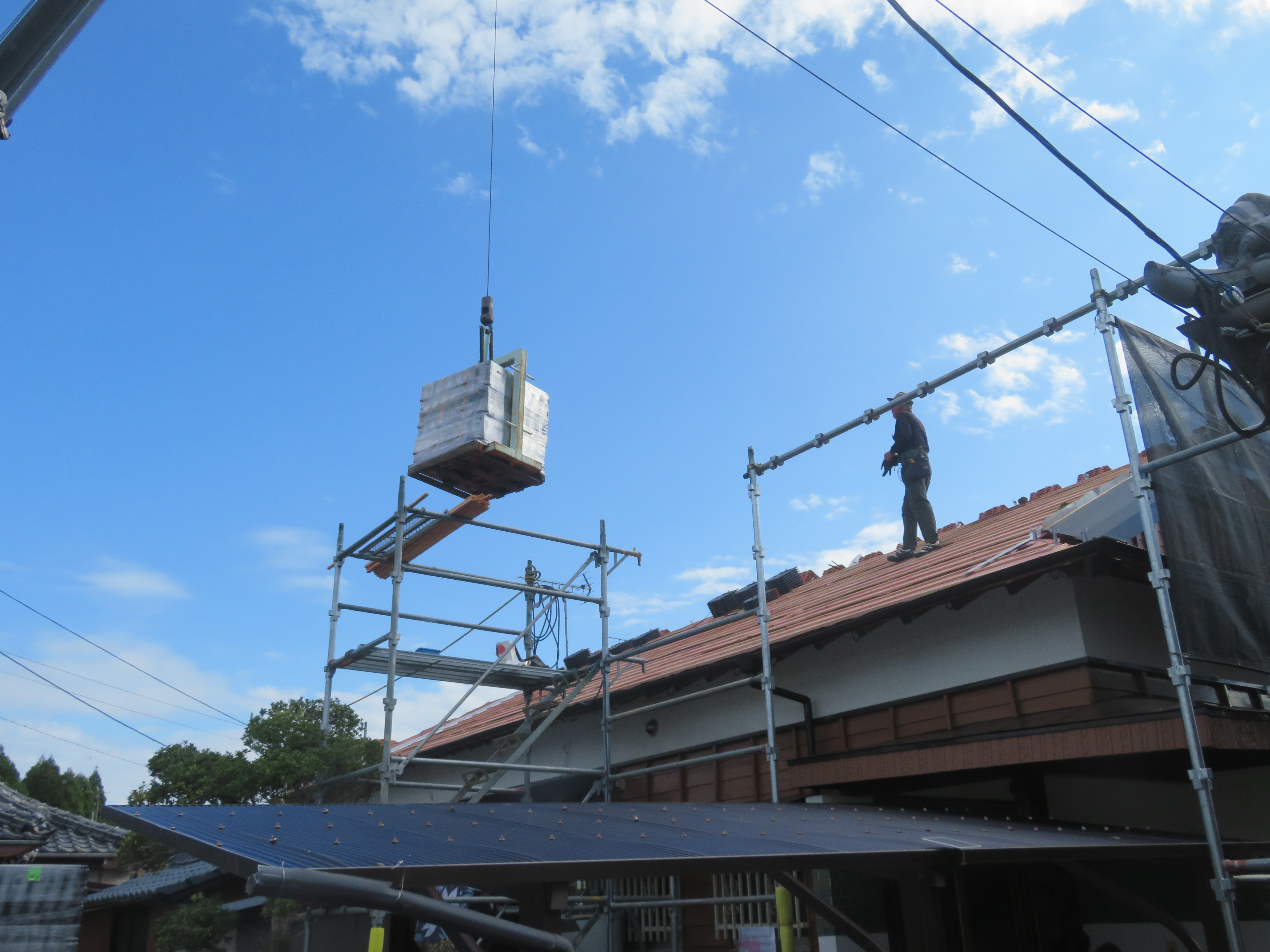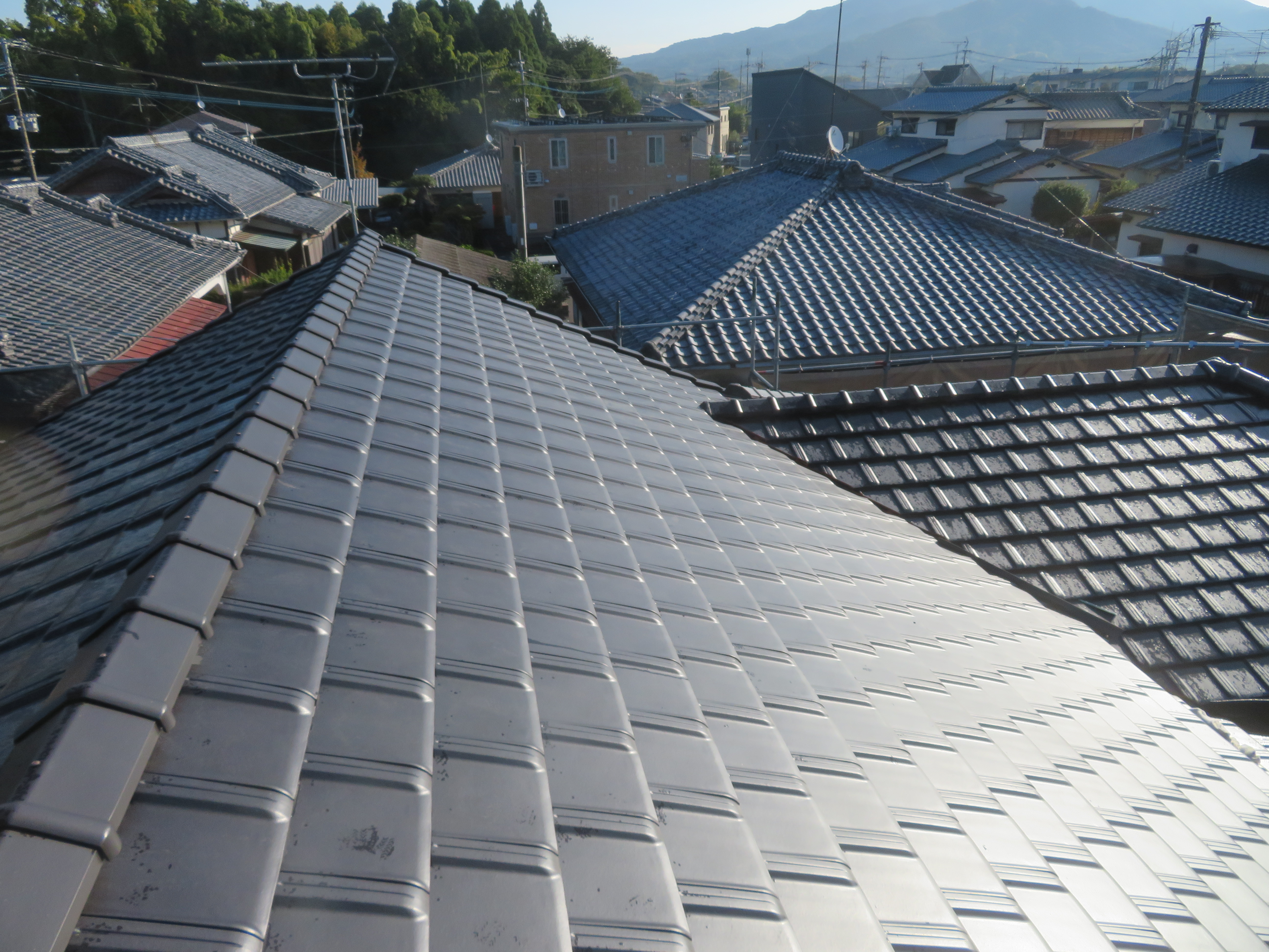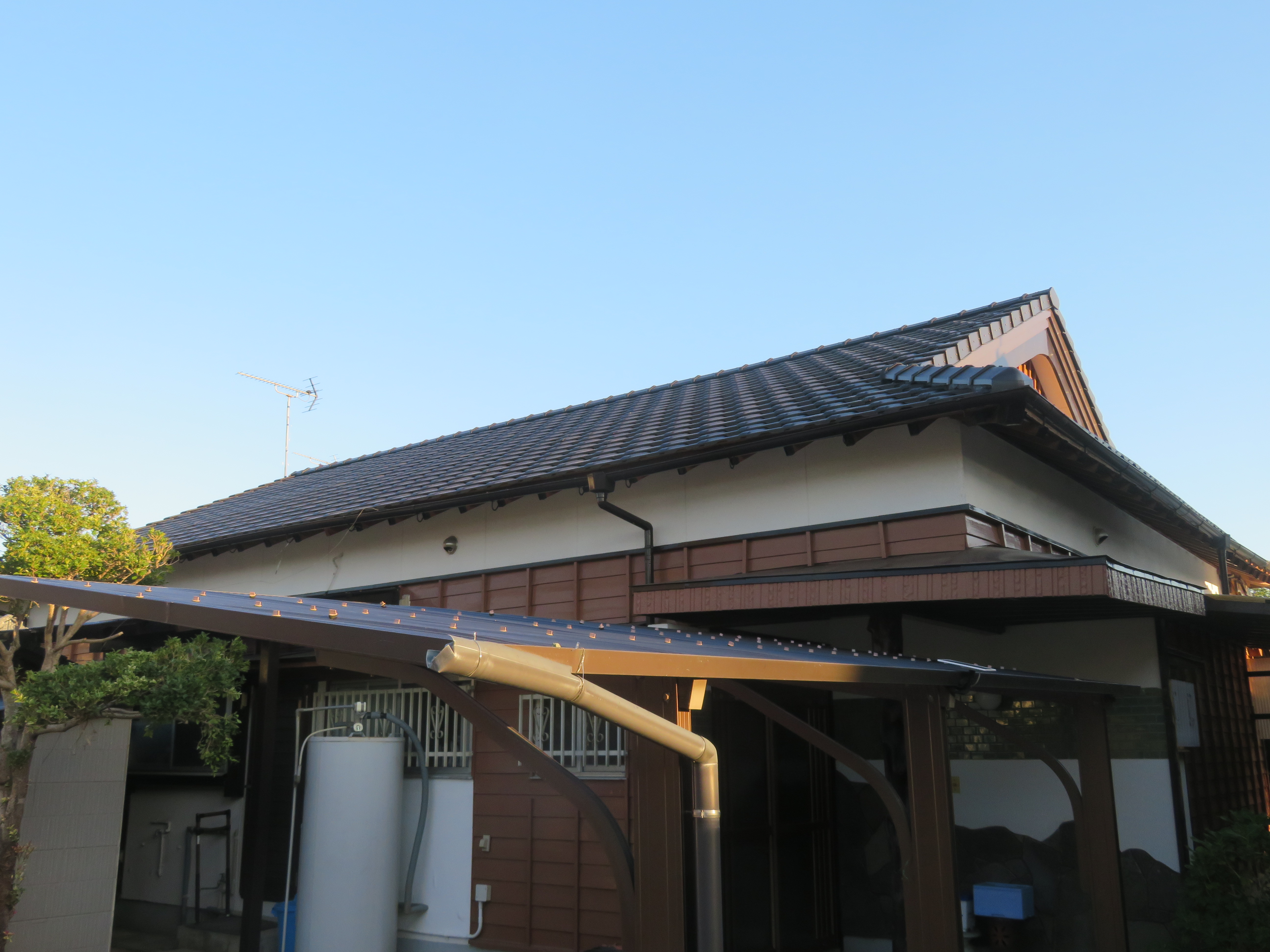 荒尾市本井手にて、屋根瓦の葺き替え 蓑甲造りの屋根を平板瓦に。 瓦を剥ぐ前に・・・。 下り棟と蓑甲を解体しました。10/6 新しい破風板を取り付けました。10/14 瓦剥ぎに取り掛かりました。 解体業者に依頼しました。 瓦を剥ぎ終わり、明日は野地板を打ちます。 10/20 ルーフィングを張れば、雨の心配はありません。 10/21 桟木を打って、瓦上げの準備完了です。 10/24 瓦を上げ始めました。 休憩中に撮影しました。 瓦を上げ終わりました。 10/25 昨日は雨でしたので、今日はここからです。 私は暫く現場をはなれます。 10/27 瓦工事は完了です。 11/1 雨と風を防ぐためのシーラー施工です。 雨樋を取り付ける為のハナ隠し板です。 雨樋を取り付けて完工です。 11/4 縁側から見た様子です。 玄関側の様子です。 2025/10/24 20:21 Tweet