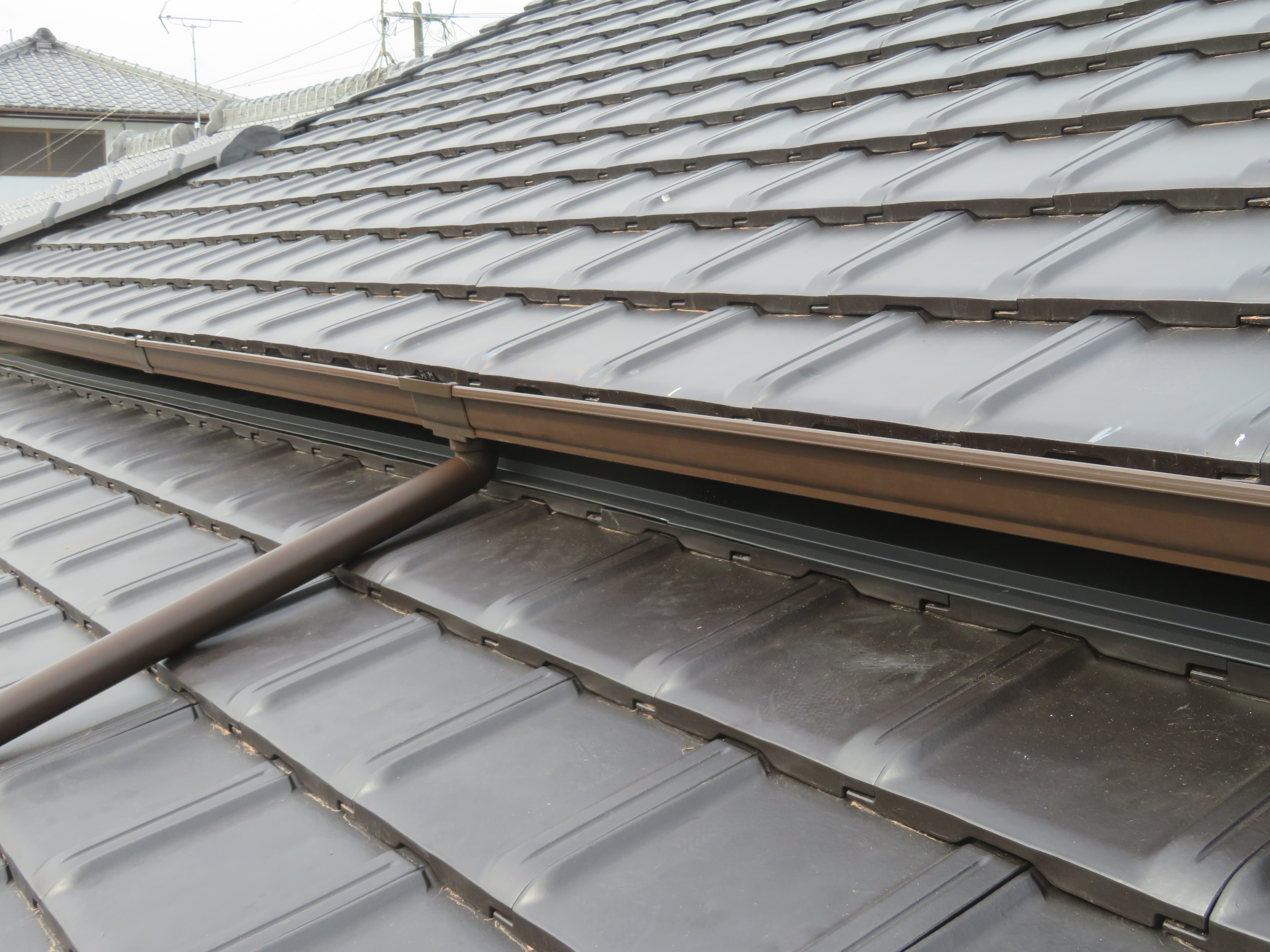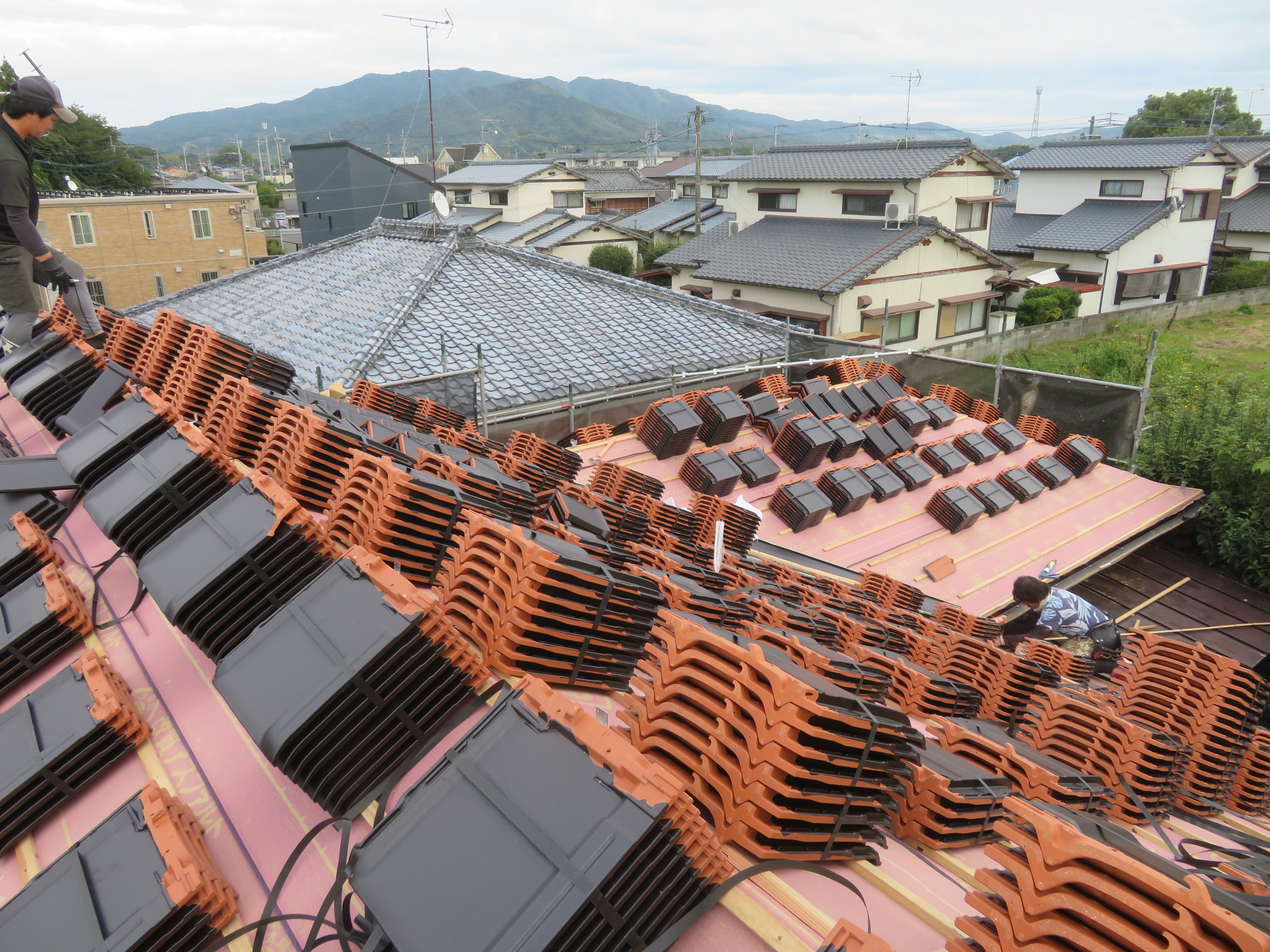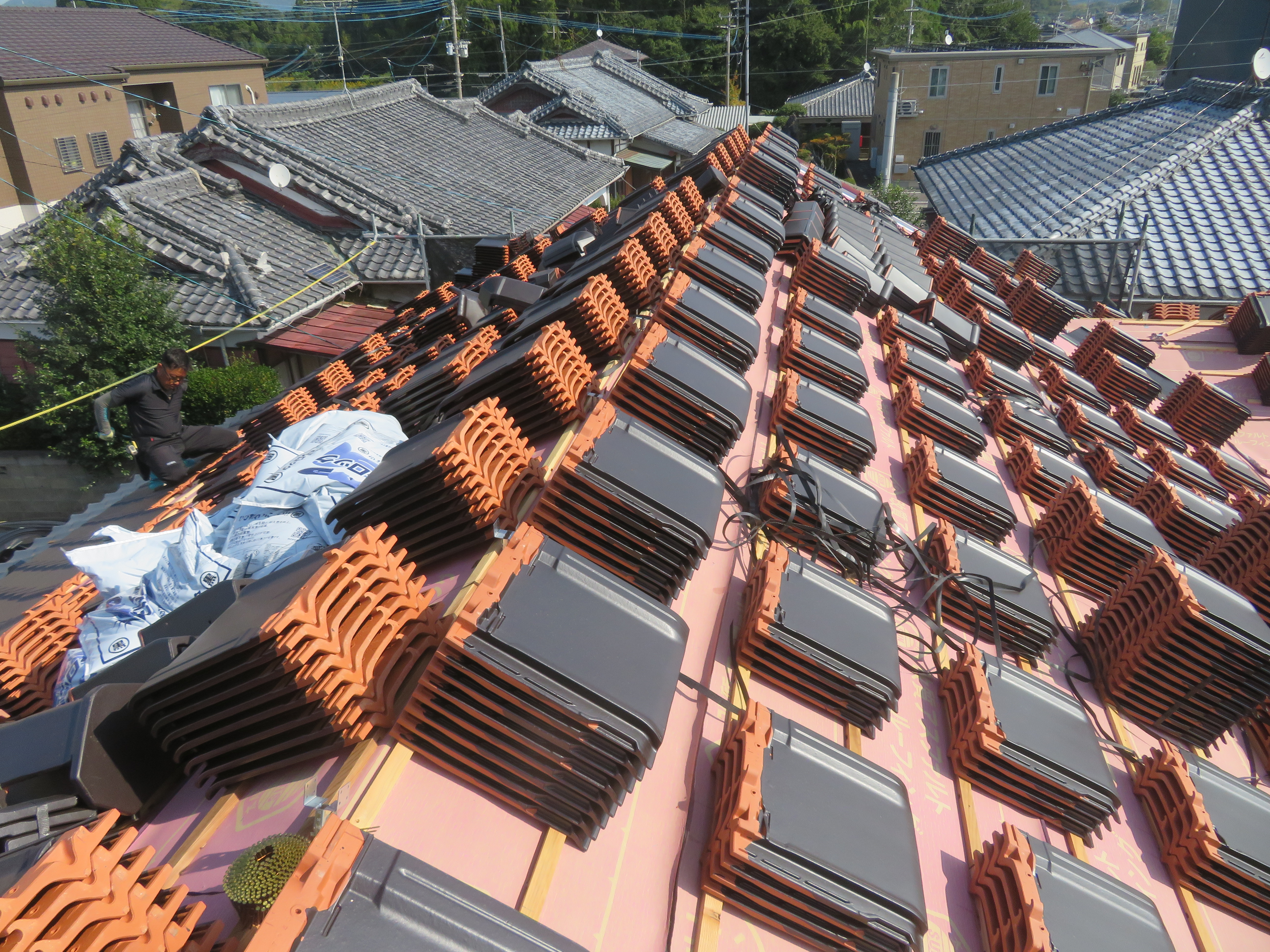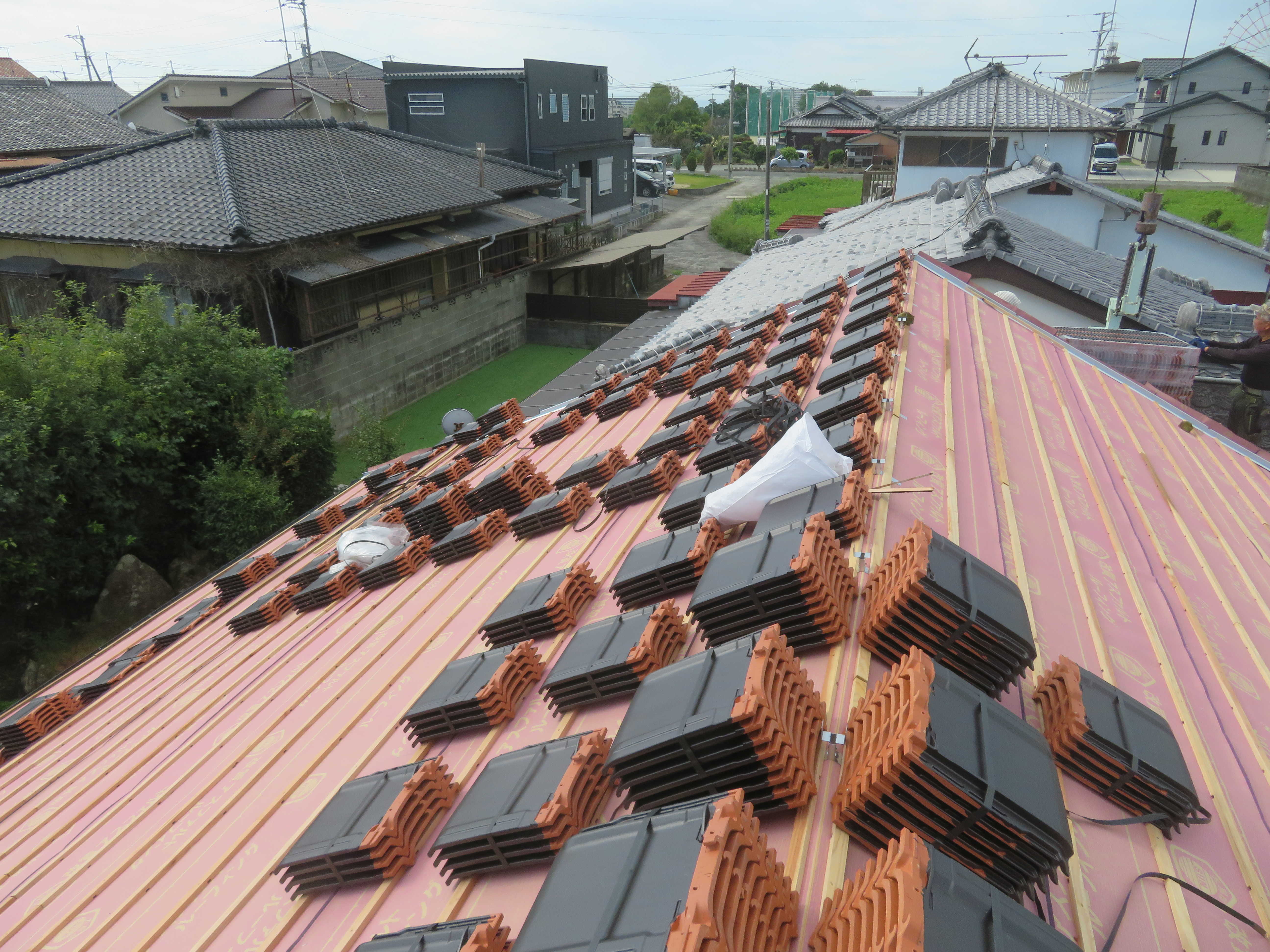 荒尾市本井手にて、屋根瓦の葺き替え 蓑甲造りの屋根を平板瓦に。 瓦を剥ぐ前に・・・。 下り棟と蓑甲を解体しました。10/6 新しい破風板を取り付けました。10/14 瓦剥ぎに取り掛かりました。 解体業者に依頼しました。 瓦を剥ぎ終わり、明日は野地板を打ちます。 10/20 ルーフィングを張れば、雨の心配はありません。 10/21 桟木を打って、瓦上げの準備完了です。 10/24 瓦を上げ始めました。 休憩中に撮影しました。 瓦を上げ終わりました。 10/25 昨日は雨でしたので、今日はここからです。 私は暫く現場をはなれます。 10/27 瓦工事は完了です。 11/1 雨と風を防ぐためのシーラー施工です。 雨樋を取り付ける為のハナ隠し板です。 雨樋を取り付けて完工です。 11/4 縁側から見た様子です。 玄関側の様子です。 2025/10/24 20:21 Tweet