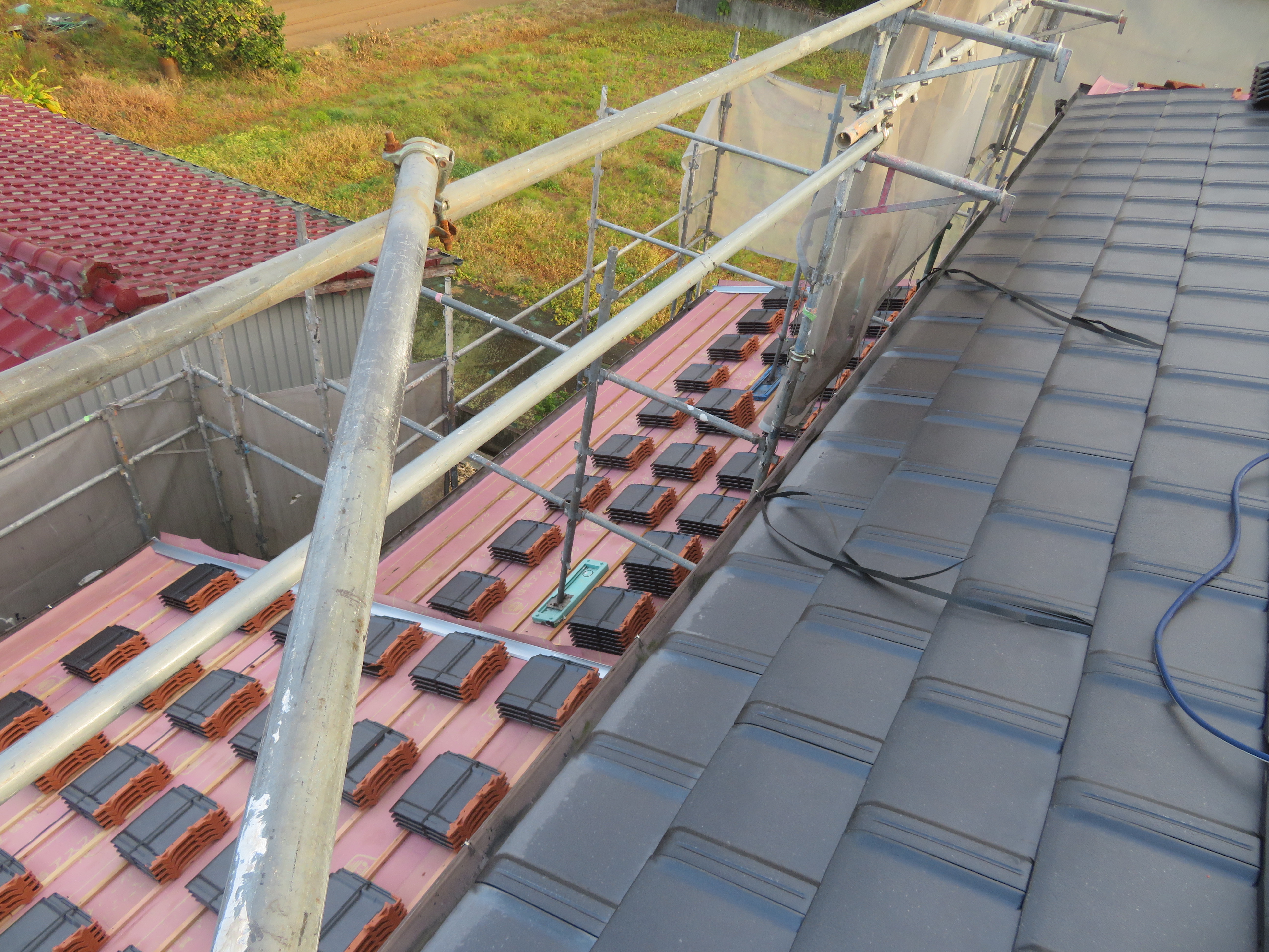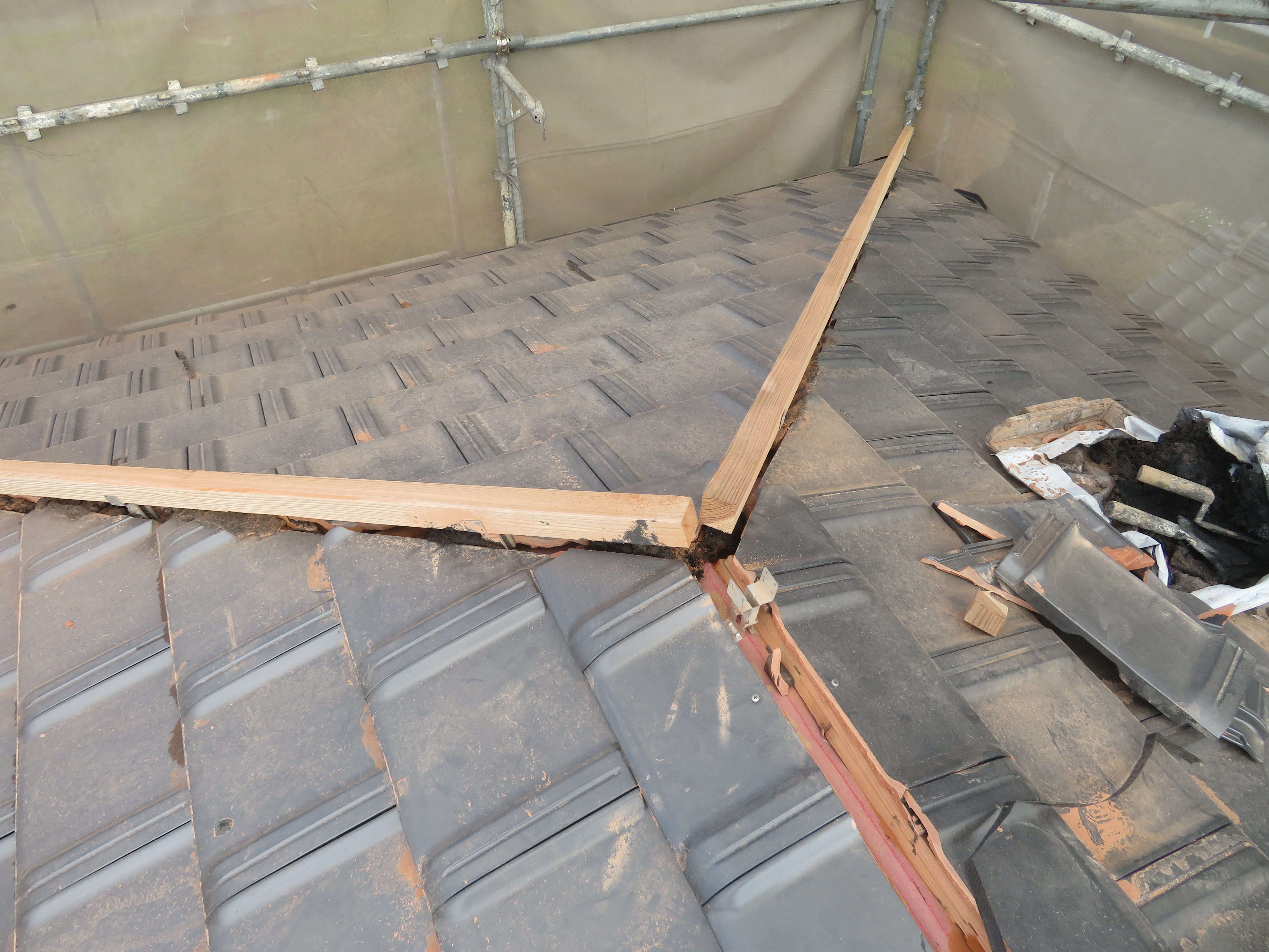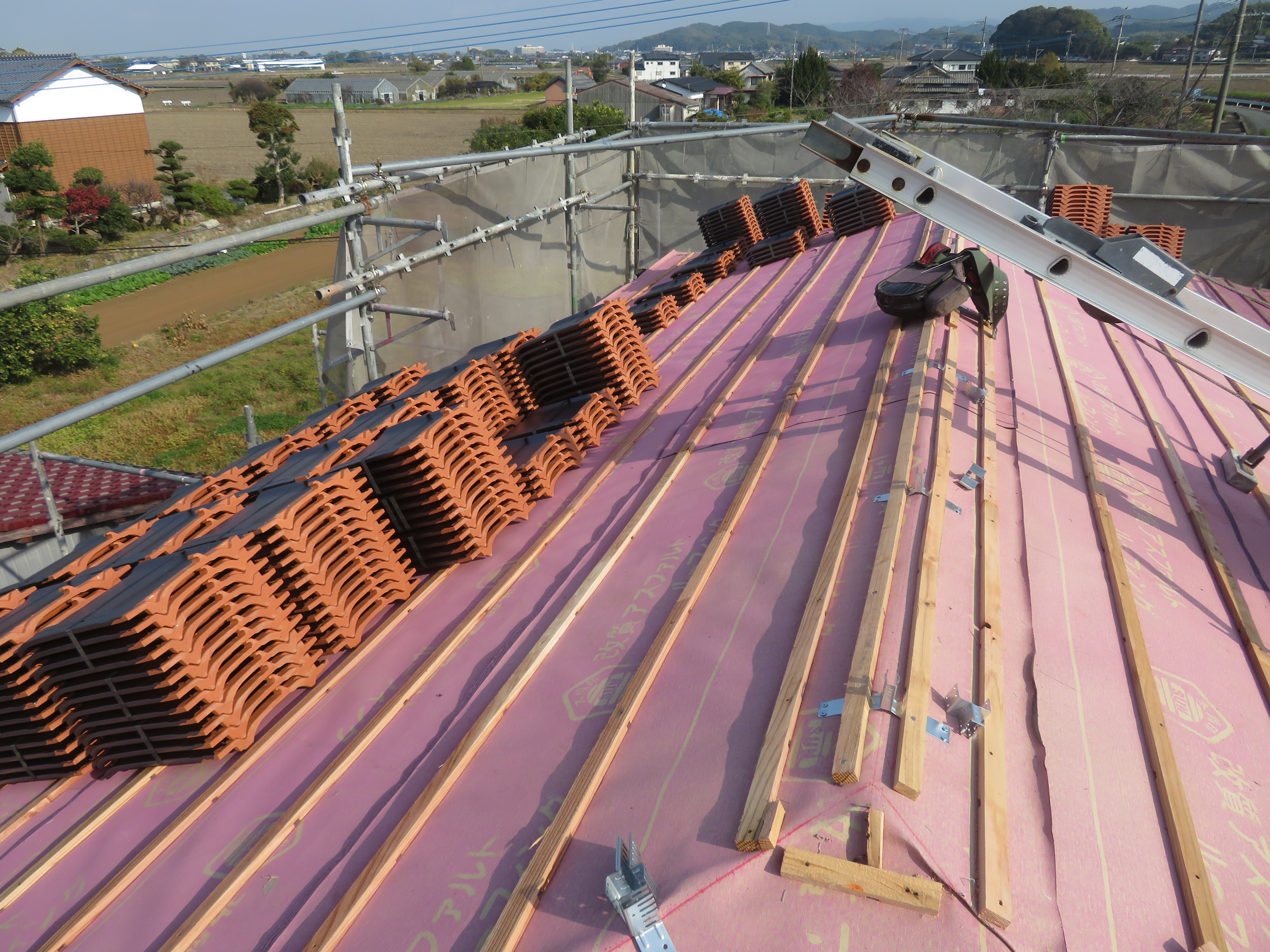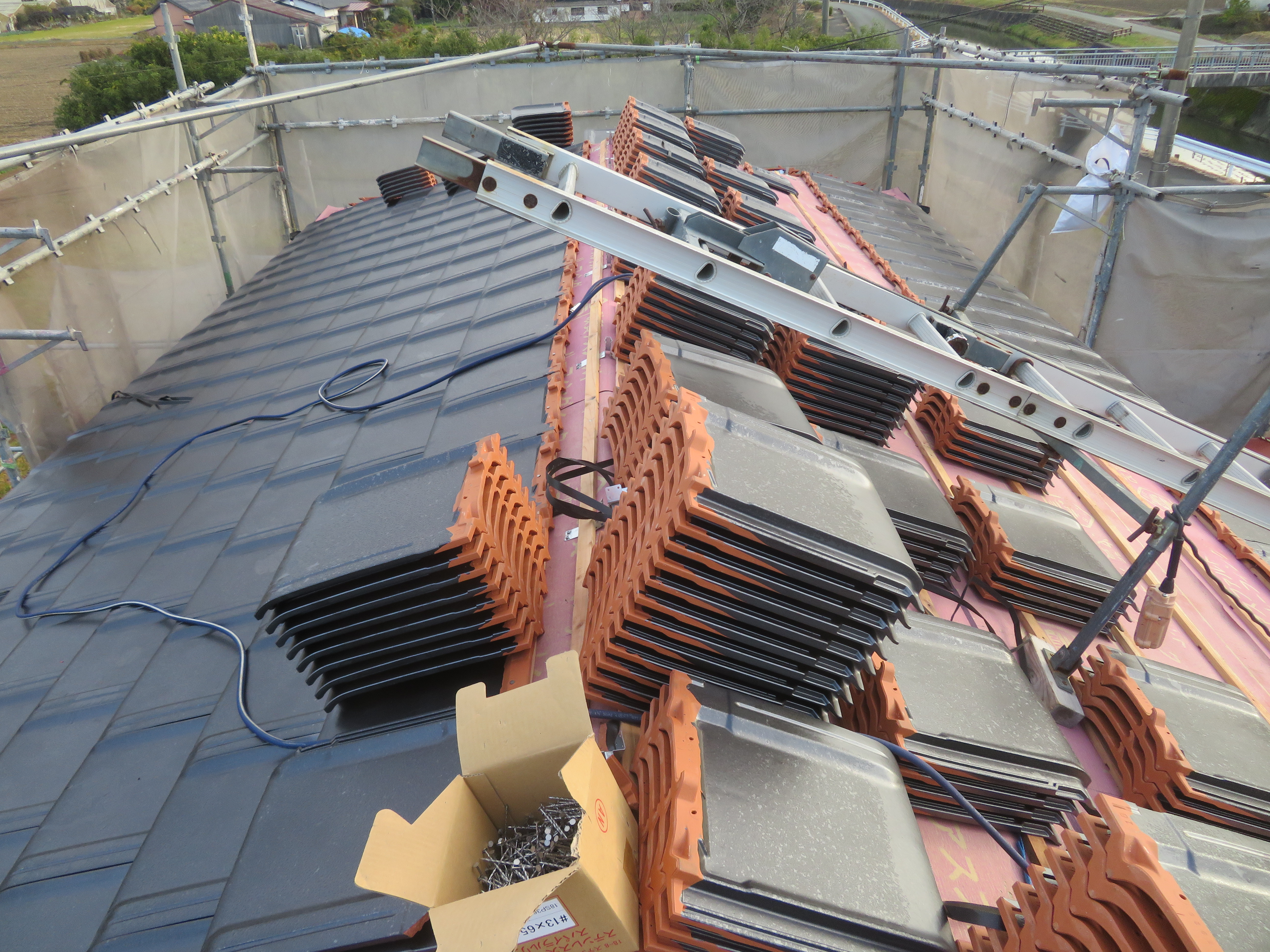 みやま市高田町:黒崎開にて屋根瓦の葺き替え 少し、遅れての更新です。 足場を組んで工事の準備です。 11/14 いつもお世話になっている解体屋さんです。 瓦を剥ぎ始めました。 11/18 悪い所を補修します。 野地板はそのままです。 ゴムアスを張って、しばらく休ませていただきます。 11/19 桟木を打って、瓦を上げます。 瓦を上げおわりました。 11/25 手分けして下屋根に移ります。 11/26 本棟施工の準備です。 隅棟施工の準備です。 モルロック(漆喰)がズレないように瓦くずをシリコンで接着します。 11/30 上りのし積みの様子です。 水平のし積みの様子です。 12/01 追加工事の屋根板金が終わりました。 12/15 2025/11/24 09:47 Tweet