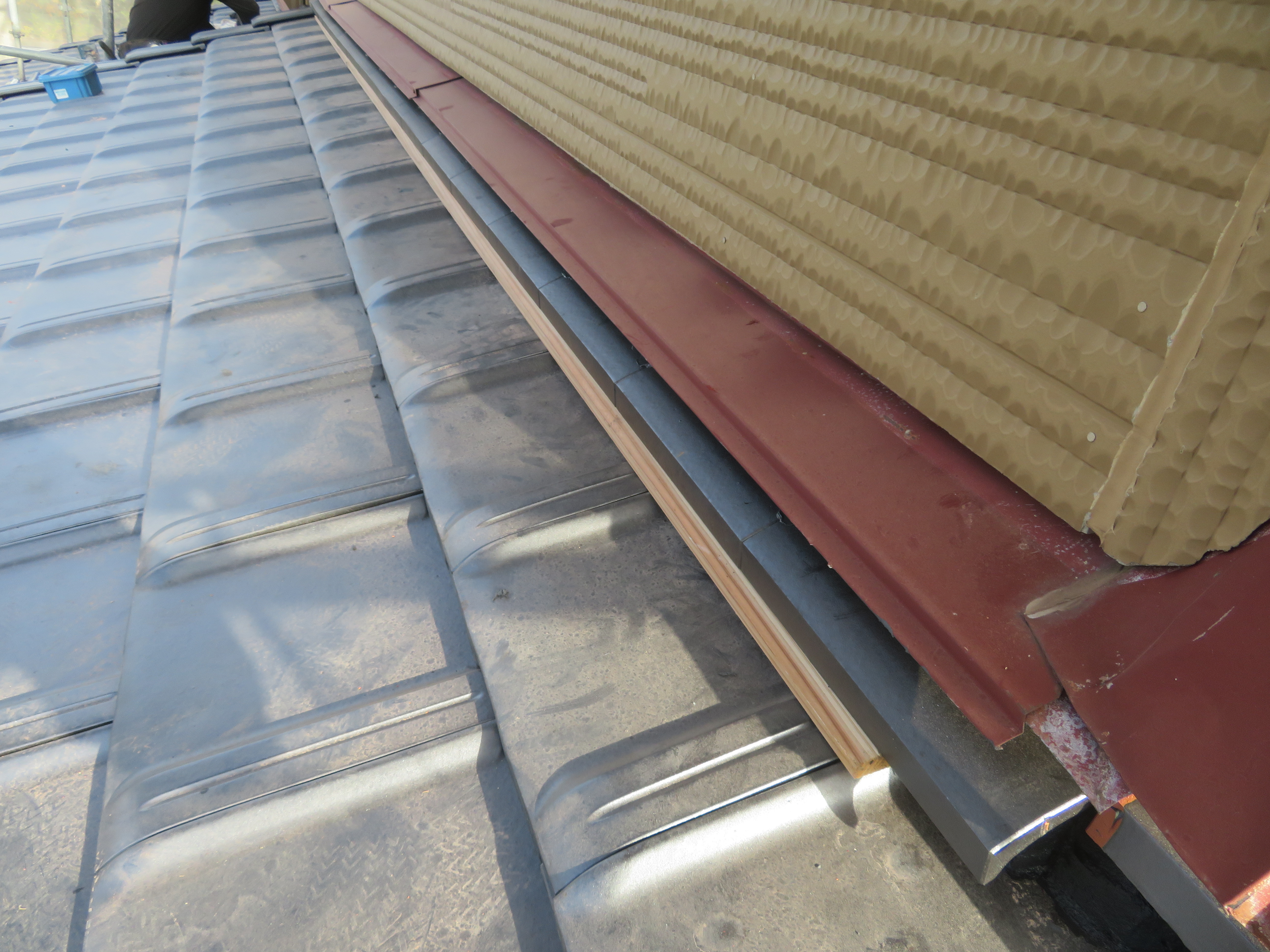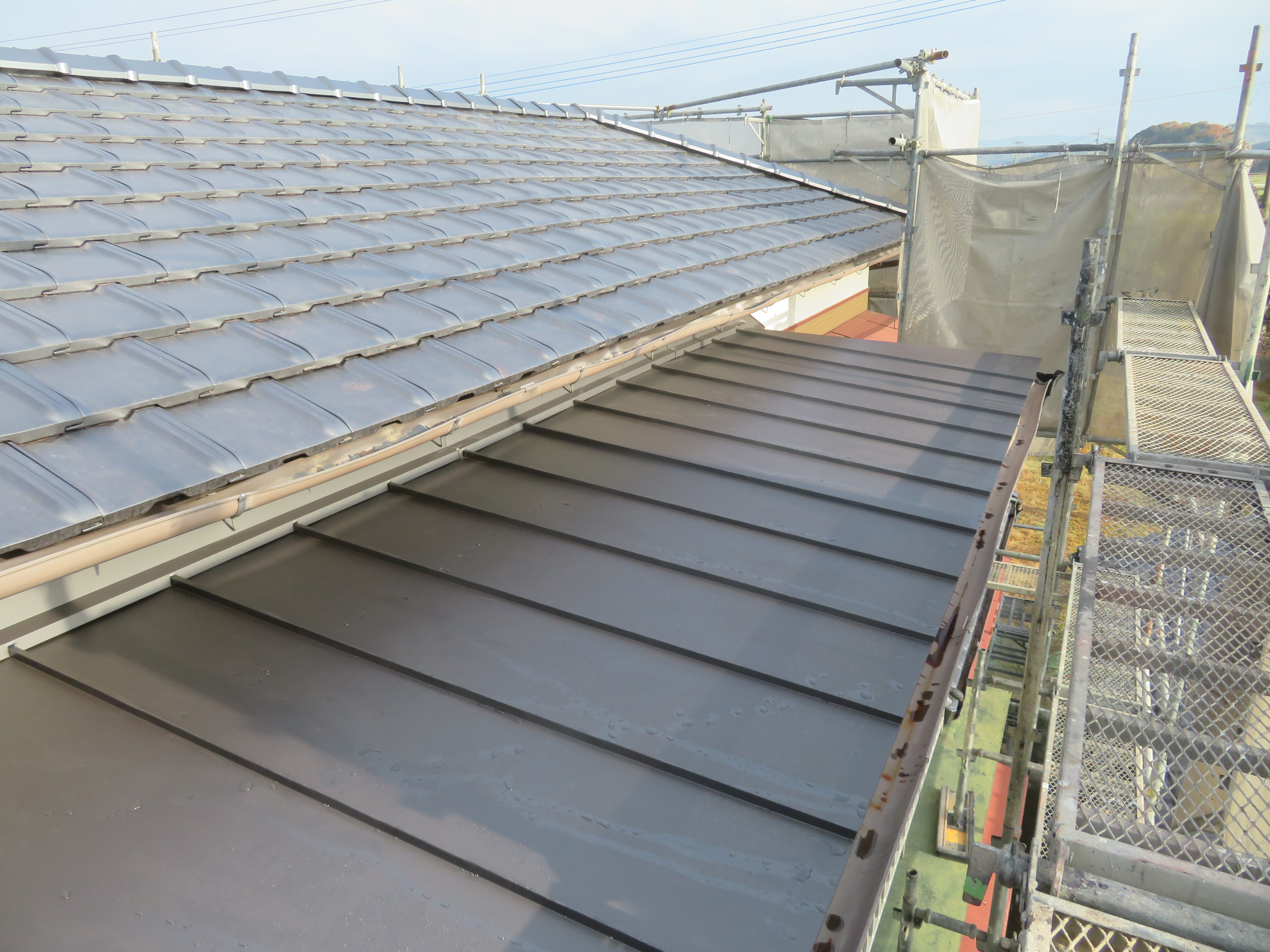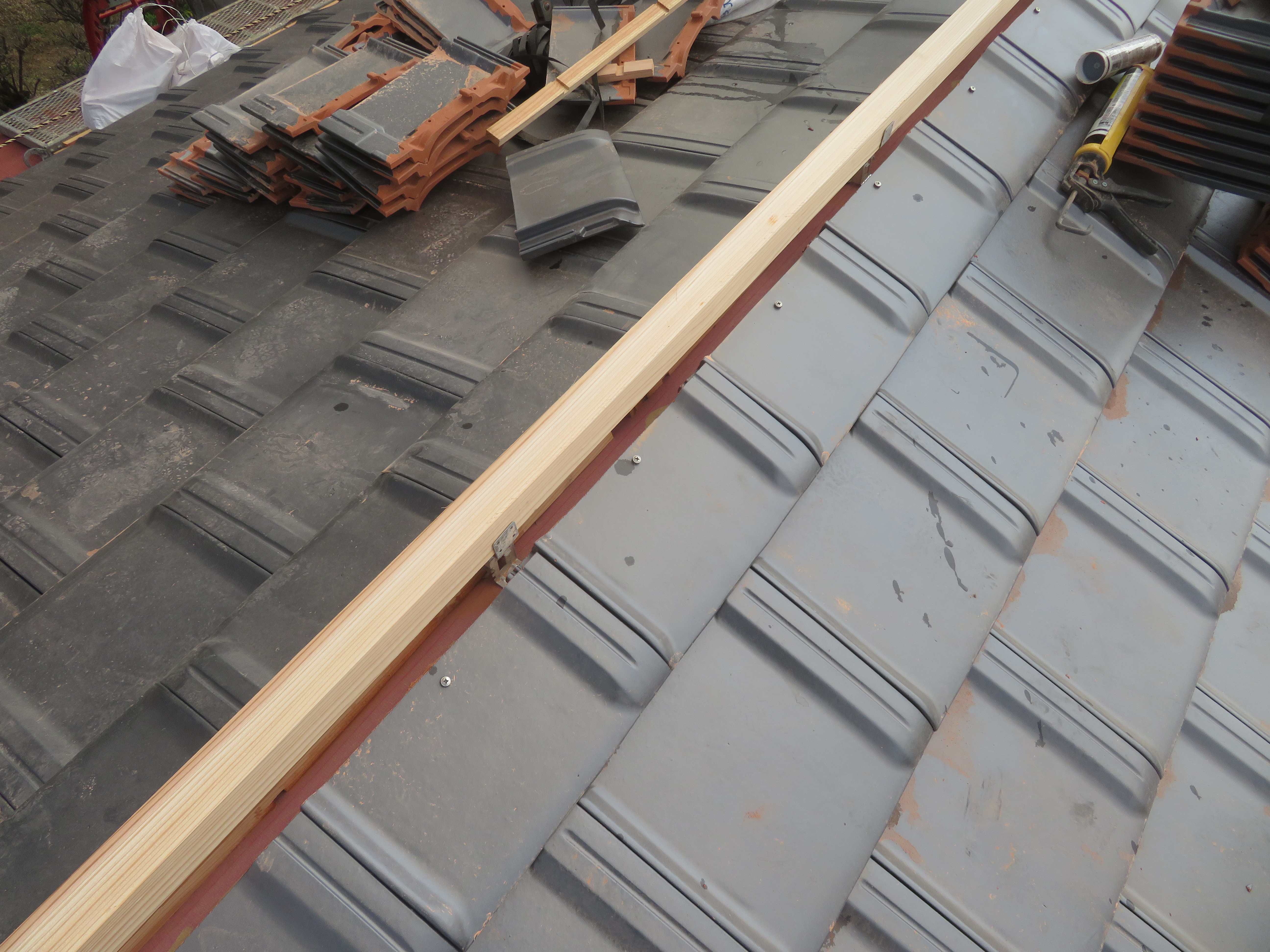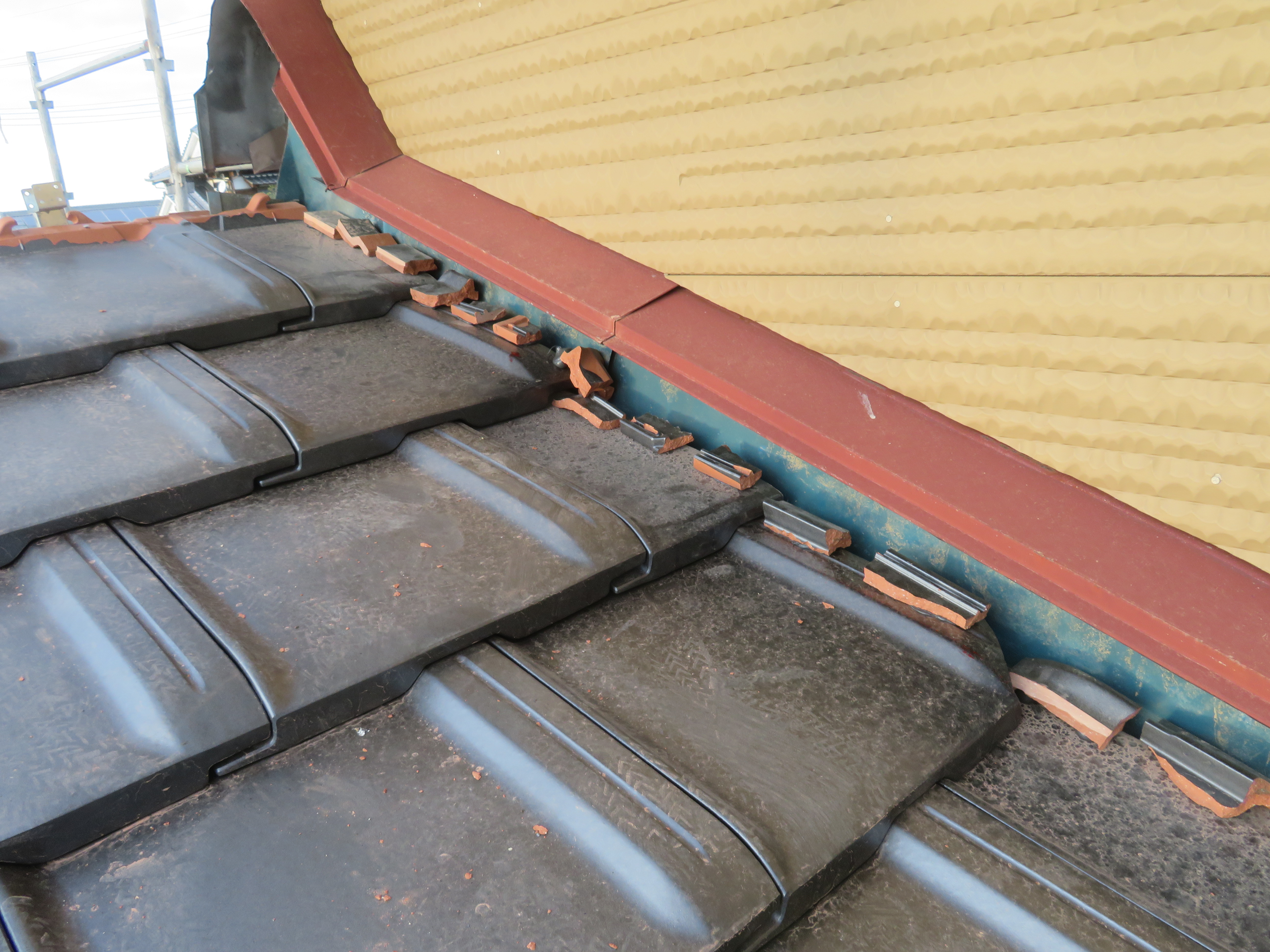 みやま市高田町:黒崎開にて屋根瓦の葺き替え 少し、遅れての更新です。 足場を組んで工事の準備です。 11/14 いつもお世話になっている解体屋さんです。 瓦を剥ぎ始めました。 11/18 悪い所を補修します。 野地板はそのままです。 ゴムアスを張って、しばらく休ませていただきます。 11/19 桟木を打って、瓦を上げます。 瓦を上げおわりました。 11/25 手分けして下屋根に移ります。 11/26 本棟施工の準備です。 隅棟施工の準備です。 モルロック(漆喰)がズレないように瓦くずをシリコンで接着します。 11/30 上りのし積みの様子です。 水平のし積みの様子です。 12/01 追加工事の屋根板金が終わりました。 12/15 2025/11/24 09:47 Tweet