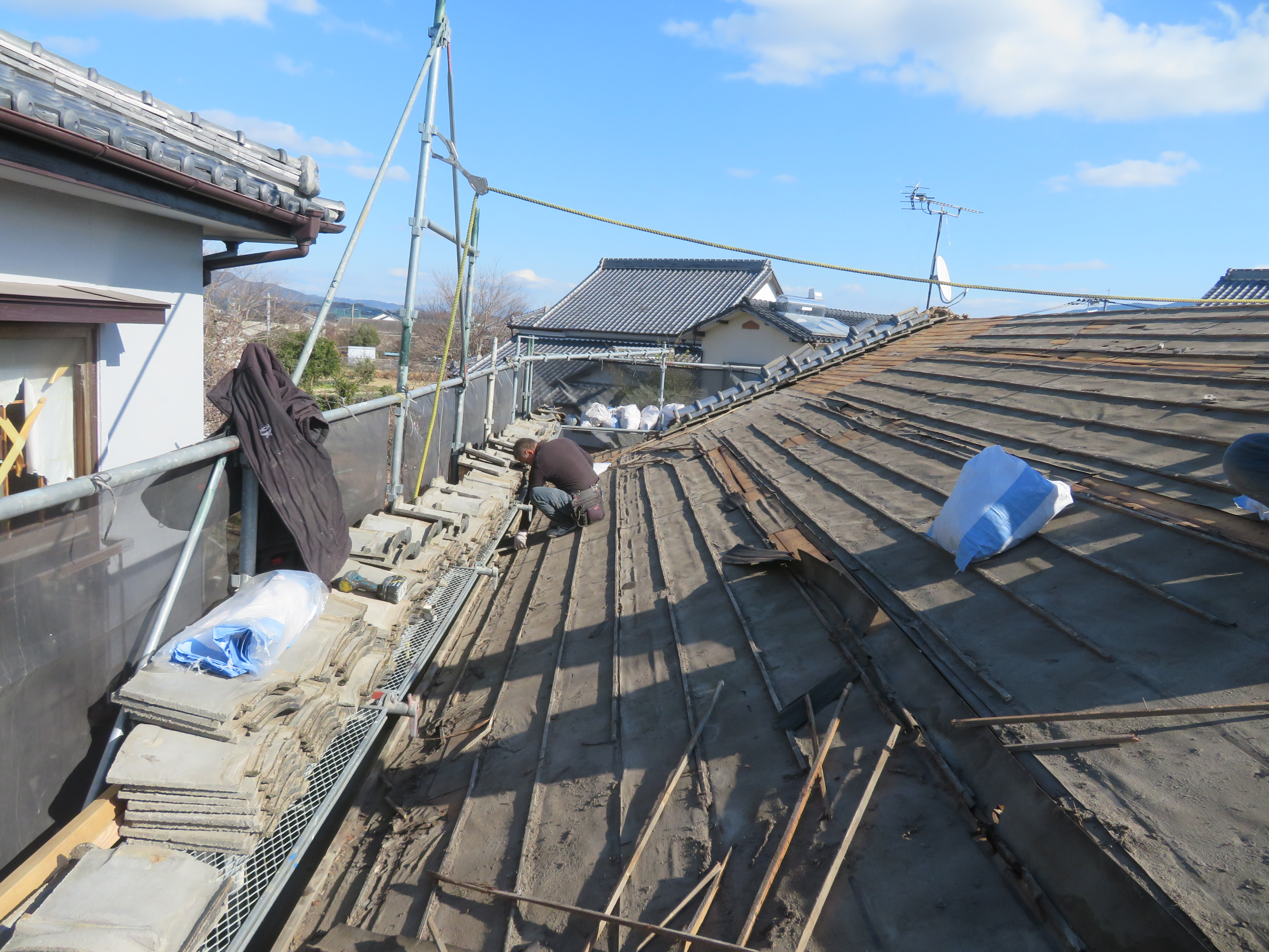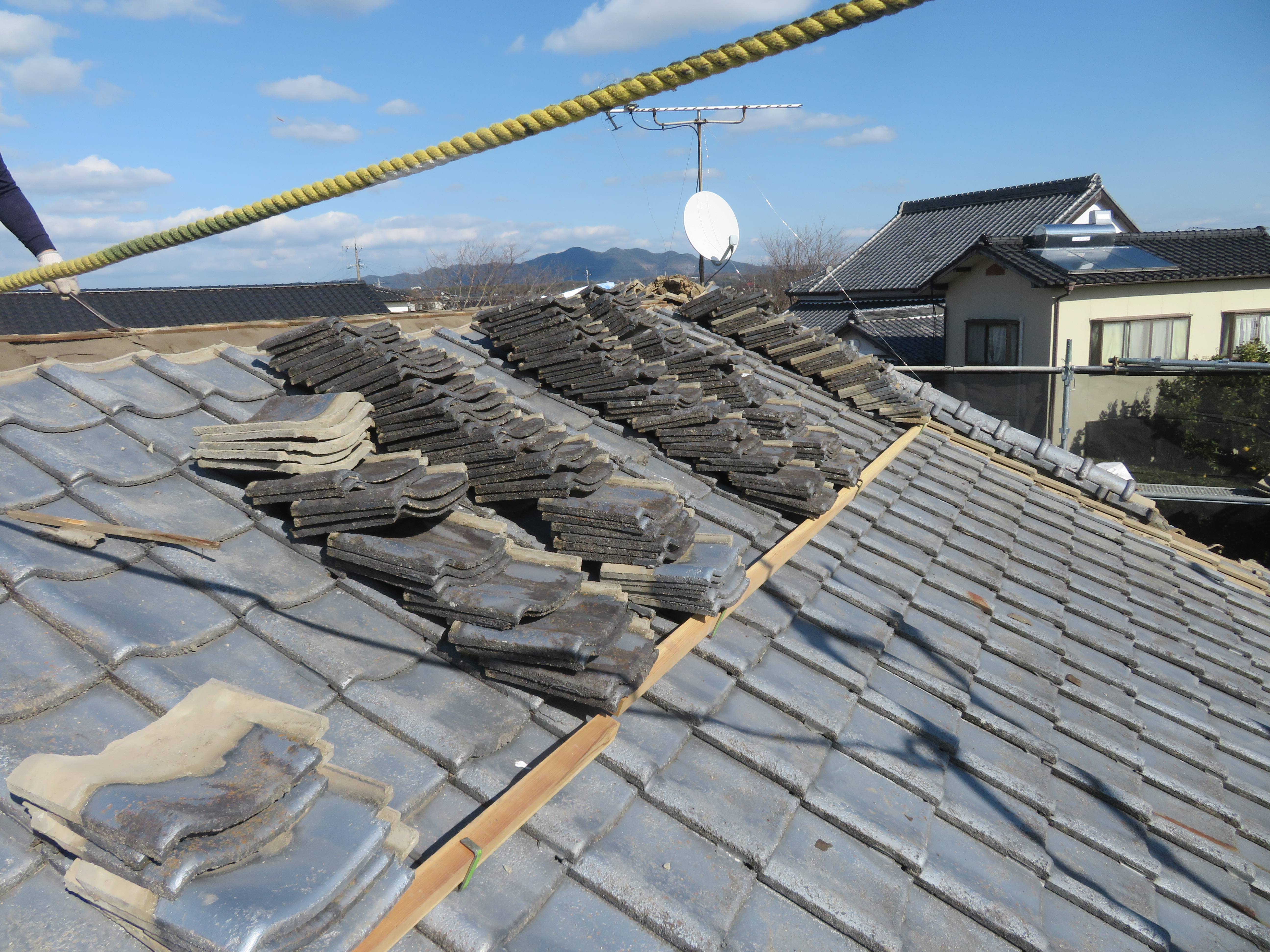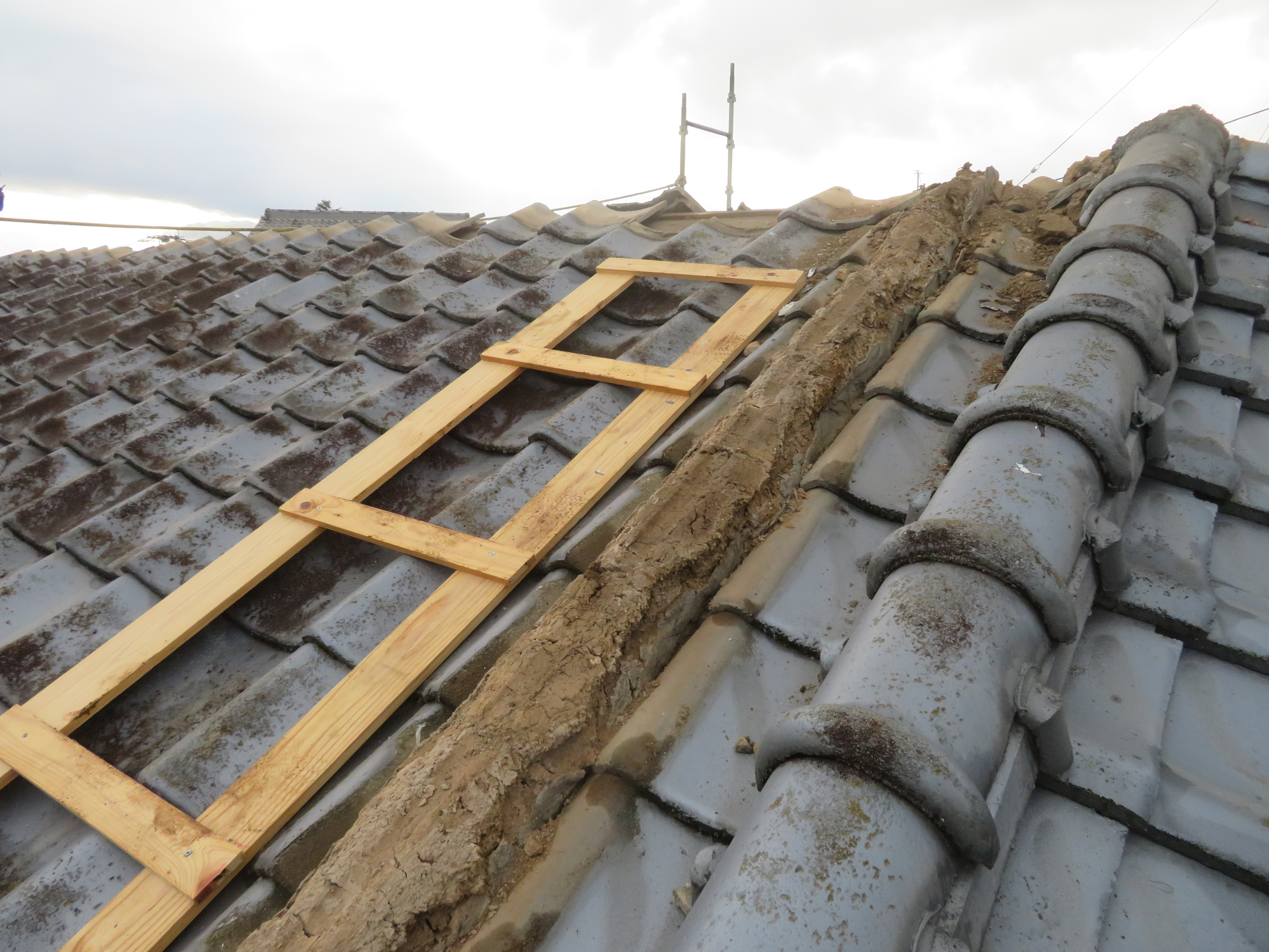 玉名市大浜町にて既存瓦の葺き直し 雨漏りが止まればよい。とのことで、このような工事になりました。 本棟・隅棟・下り棟を解体処理します。 剥いだ瓦を移動させます。 古い桟木とフェルトは取り除きます。 ゴムアスルーフィングを張ります。 桟木を打ち直します。 シロアリでスカスカになっていました。 シロアリ食害部分はすべて取り除きました。 地瓦を葺き直し棟は7寸丸の強力棟です。 雨切りのしの取り付け様子です。 2026/02/08 22:11住宅 Tweet