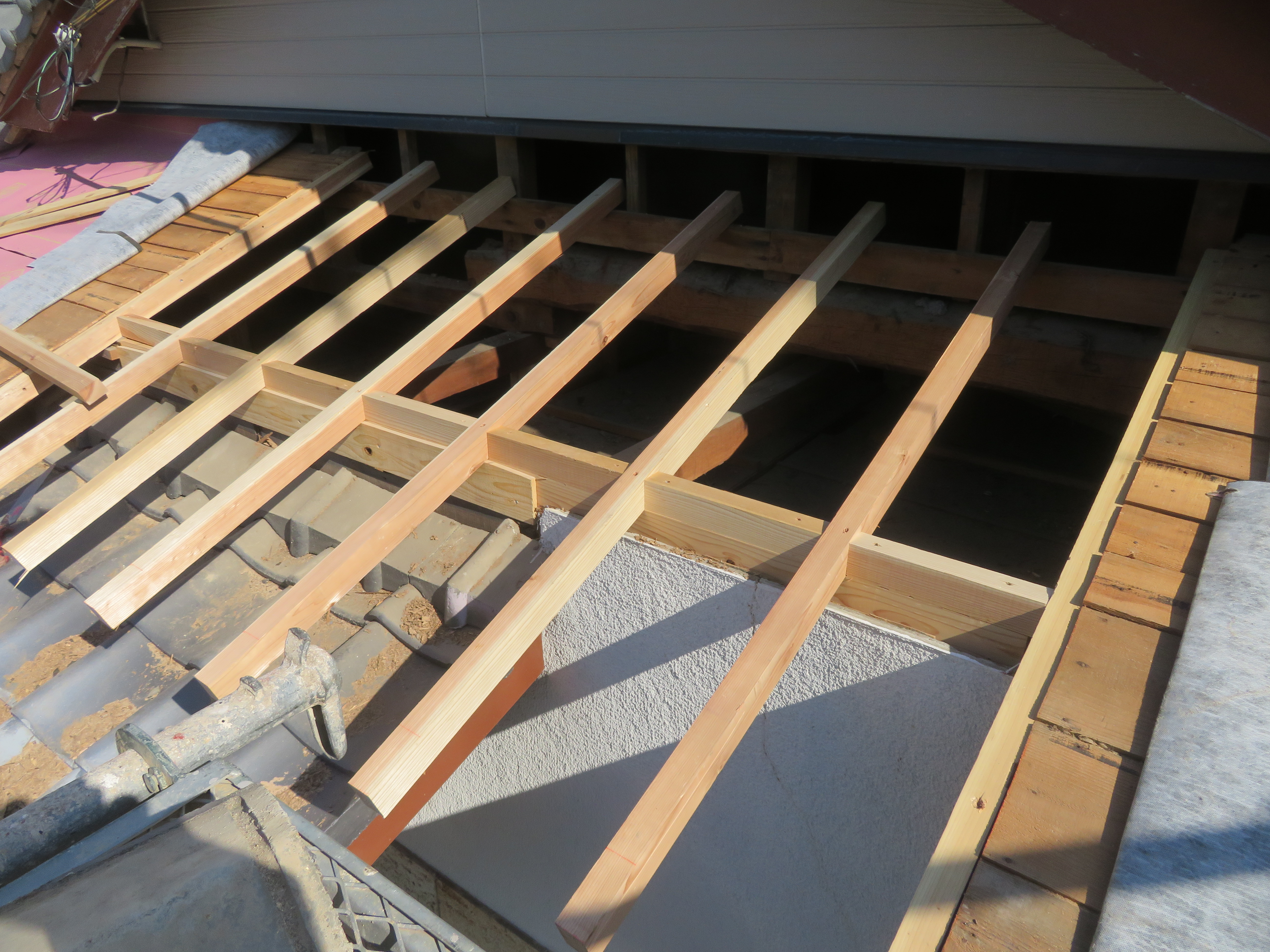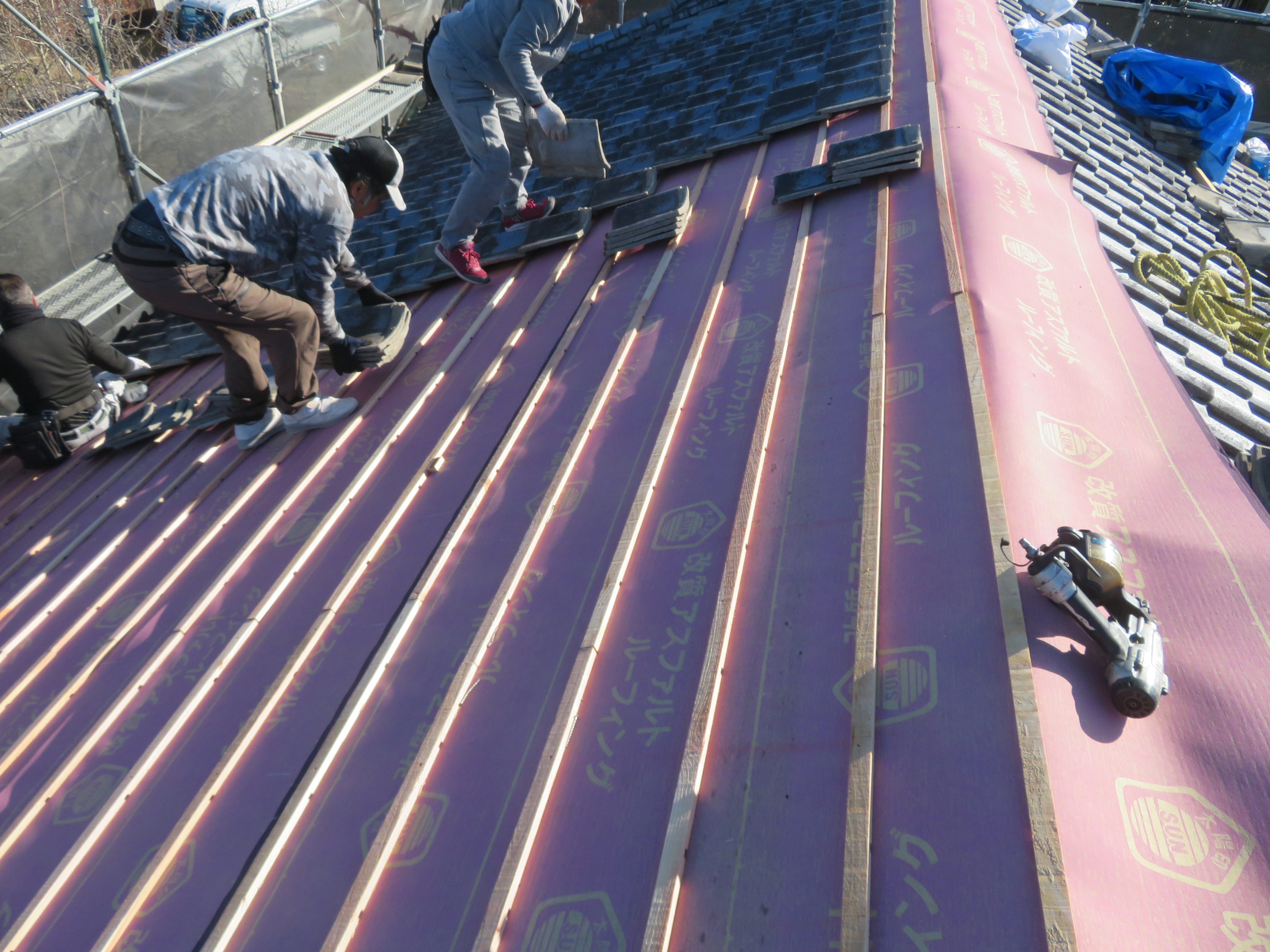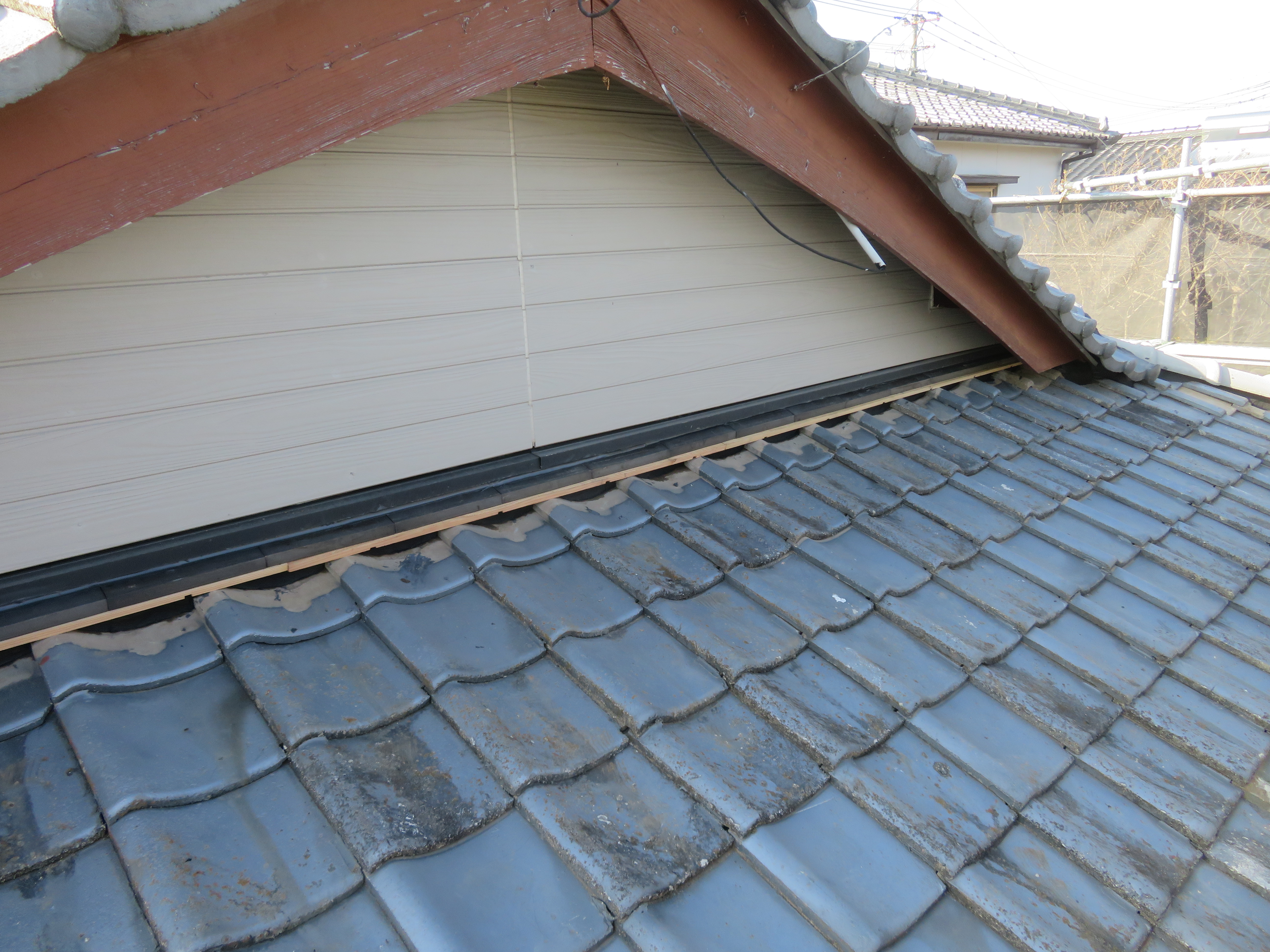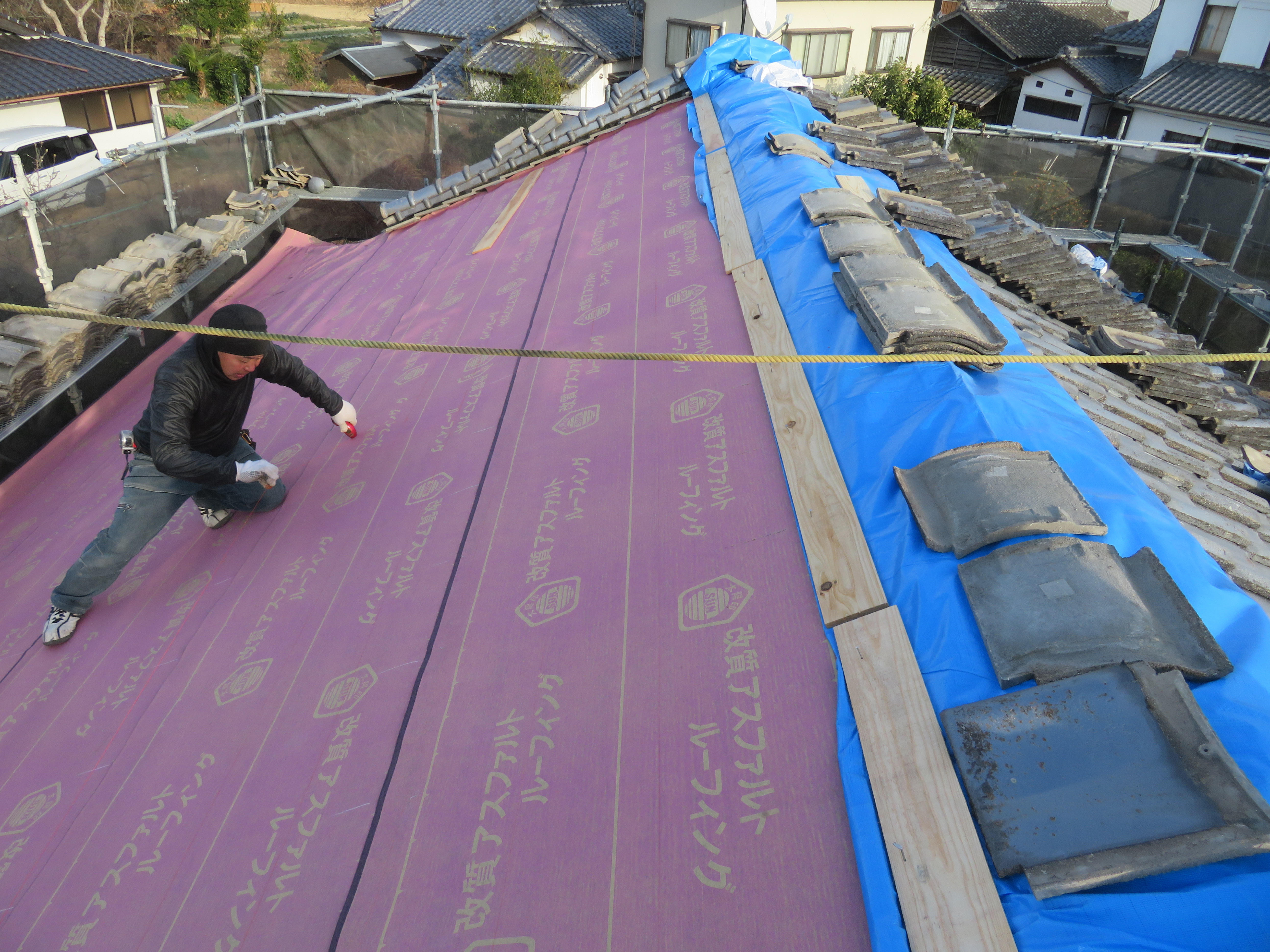 玉名市大浜町にて既存瓦の葺き直し 雨漏りが止まればよい。とのことで、このような工事になりました。 本棟・隅棟・下り棟を解体処理します。 剥いだ瓦を移動させます。 古い桟木とフェルトは取り除きます。 ゴムアスルーフィングを張ります。 桟木を打ち直します。 シロアリでスカスカになっていました。 シロアリ食害部分はすべて取り除きました。 地瓦を葺き直し棟は7寸丸の強力棟です。 雨切りのしの取り付け様子です。 2026/02/08 22:11住宅 Tweet