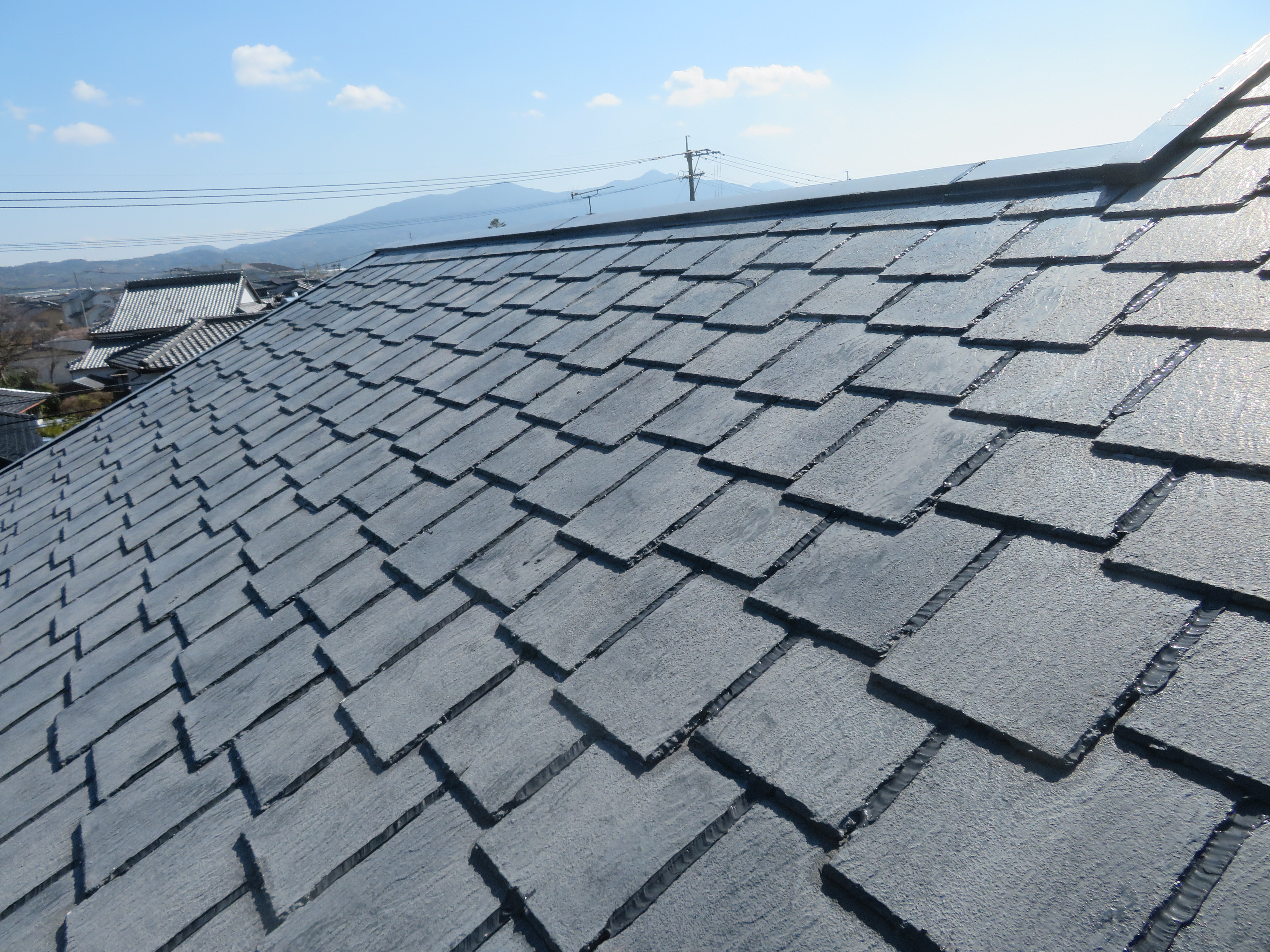 玉名市大浜において、雨漏り修理 コロニアル屋根の雨漏りです。 天井板を外して見た雨漏り個所の様子です。 塗料の塗膜が原因のようです。 塗膜を切り開けて水が流れるようにします。 雨だけでなく風にも強いシリコンの塗り方です。 これで、完工です。 2026/02/19 08:51 Tweet