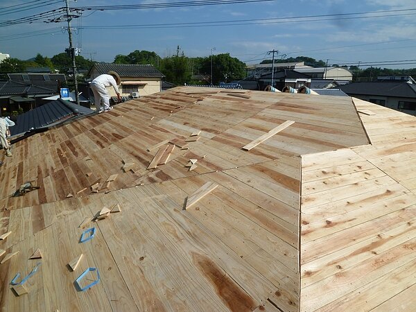 遅れてのブログ更新です。 朝から、必死で瓦を剥ぎました。産廃の瓦を処理場に運びます。古い瓦はリサイクルされて、道路工事などに使われます。処理場に瓦を降ろしたあと、問屋まで新しい瓦を引き取りに行きました。その間に野地板の重ね打ちが終わって、ルーフィングが張られていました。昼食の…