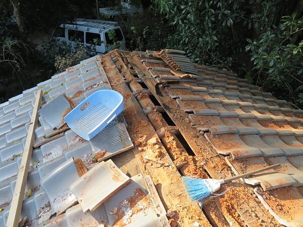 古い陶器瓦を鶴弥の平板瓦に葺き替えます。約40年前に建てられた家の瓦です。瓦の下地はご覧のとおりです。野地板を重ねて下地を強化します・この部分には構造用合板を張ります。11/4構造用合板で、下地を補強しました。ゴムアスを張ります。桟木を打って瓦上げの準備です。クレーンを使っての瓦上げ…